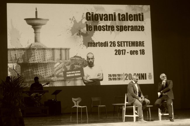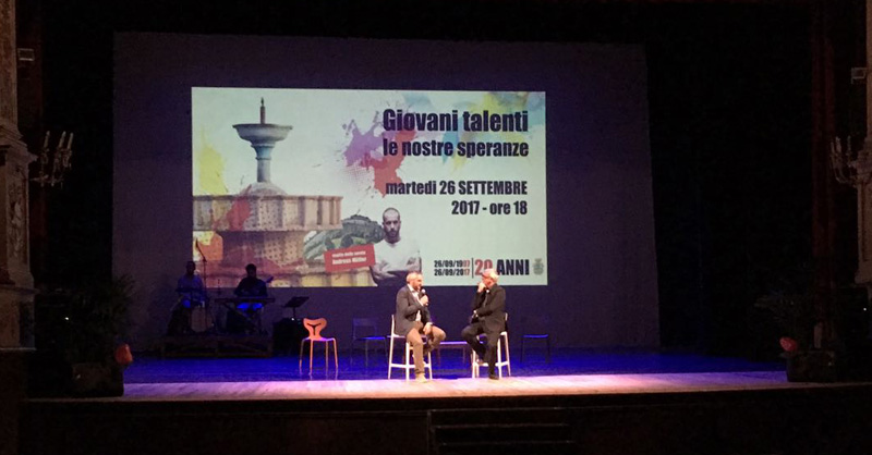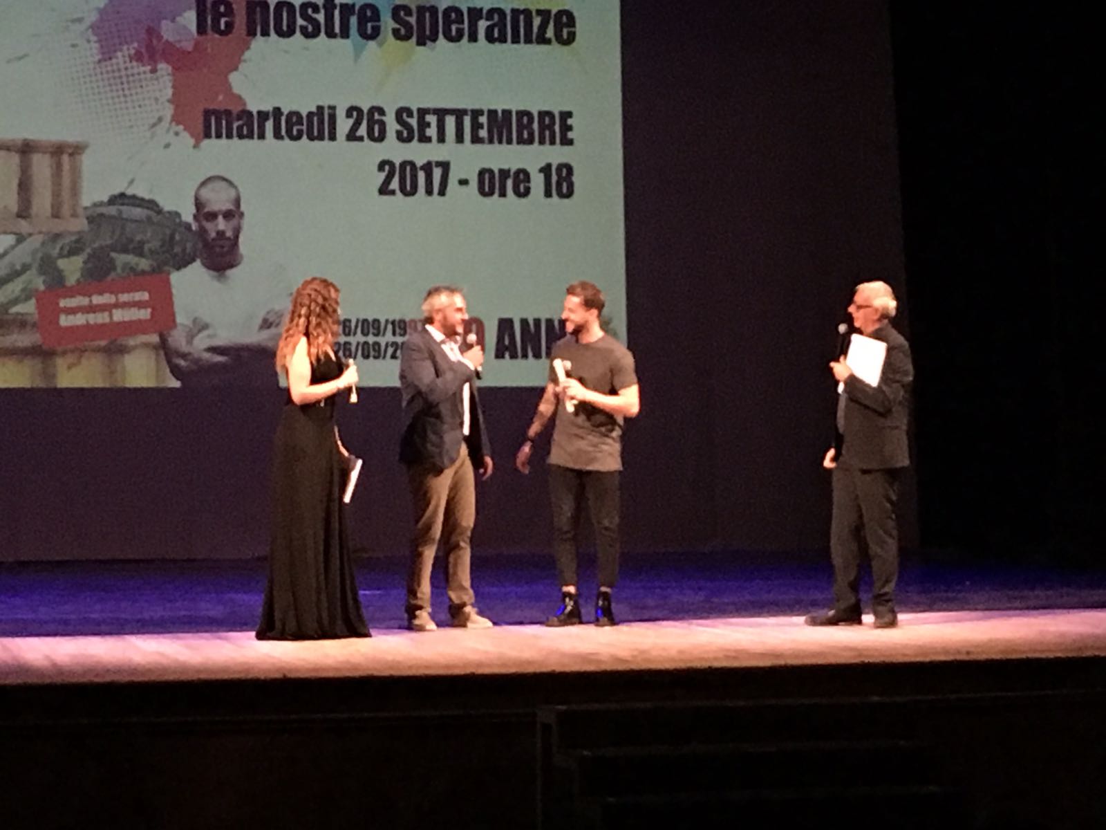 Tanti i protagonisti sul palco (tutti fabrianesi doc) introdotti dalla co-presentatrice Lara Gentilucci, che hanno raccontato le loro storie spaziando in diversi settori, dall’apicoltore Giorgio Poeta, alla cantante lirica Beatrice Mezzanotte, dalle ginnaste Talisa Torretti e Milena Baldassarri. Uno dei momenti topici della serata è stata l’entrata in scena di Andreas Muller, il ballerino vincitore di Amici 2017 (leggi l’articolo). “Torno sempre volentieri a Fabriano perché è casa mia. – ha esordito al microfono Andreas – Vorrei dire a tutti quei giovani che mi contattano e mi seguono che non è stato facile, ho vissuto momenti difficili anche io, ma che solo seguendo i propri sogni si può arrivare dove si vuole”. Poi ha annunciato di aver scritto un libro “che uscirà presto per Mondadori soprattutto per lanciare questo messaggio, non tanto per parlare di me”.