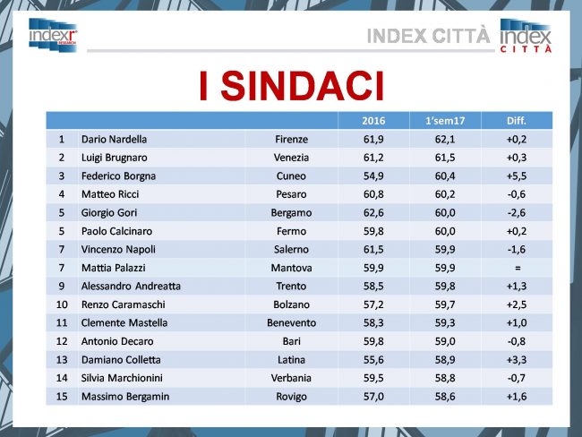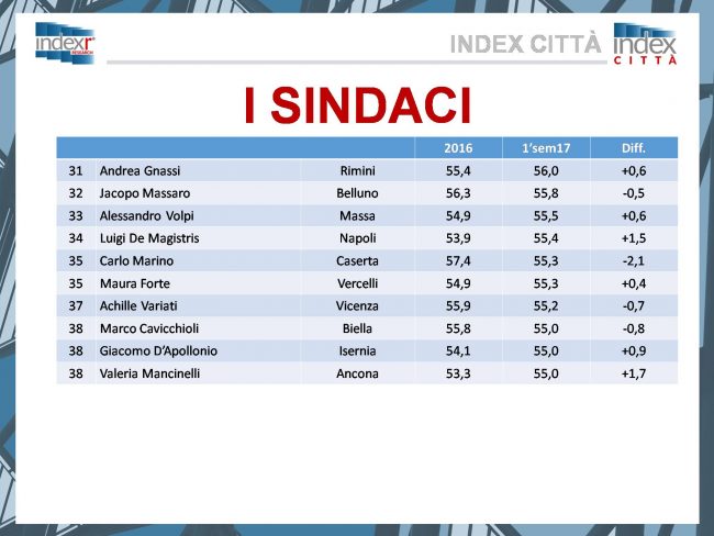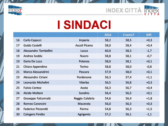 Lo sprint dell’ultimo anno inserisce Valeria Mancinelli nella pattuglia dei sindaci più graditi dai propri cittadini, seppure riesca ad entrare nel club dei 38 sindaci d’Italia all’ultimo posto. E’ il risultato del sondaggio dell’istituto di ricerca Index Research che mette in fila i sindaci delle città capoluogo in base alla soddisfazione dei propri cittadini circa il loro operato durante il primo semestre del 2017. Il sindaco di Ancona si piazza così al 38esimo posto con il 55% di gradimento da parte degli anconetani. Così attesta il sondaggio compiuto telefonicamente su un campione di 500 maggiorenni rappresentativi per età, sesso e stato sociale, realizzato dall’istituto di ricerca tra marzo e giugno di quest’anno. Ultimo posto, si diceva, perché la classifica prende in esame solo i sindaci che hanno raggiunto o superato il 55%. Tra i sindaci delle grandi città non compaiono perciò il sindaco di Milano Giuseppe Sala e il sindaco di Roma Virginia Raggi, entrambi sotto la soglia di gradimento. Mancinelli riesce a classificarsi invece grazie allo sprint dell’ultimo anno: 1,7% in più rispetto al 2016, quando lo stesso rilevamento aveva fermato il sindaco al 53,3%. La classifica è guidata da Dario Nardella (Firenze), Luigi Brugnaro (Venezia), Federico Borgna (Cuneo) e Matteo Ricci (Pesaro), al 60,2%% nonostante il calo dello 0,6% rispetto al primo semestre 2016. Quinto il sindaco di Fermo Paolo Calcinaro, con il 60%, in leggero miglioramento. Meglio del sindaco del capoluogo marchigiano fanno anche i colleghi di Ascoli Guido Caselli (17esimo con il 58,4%) e Macerata Romano Carancini (28esimo con il 56,3%).