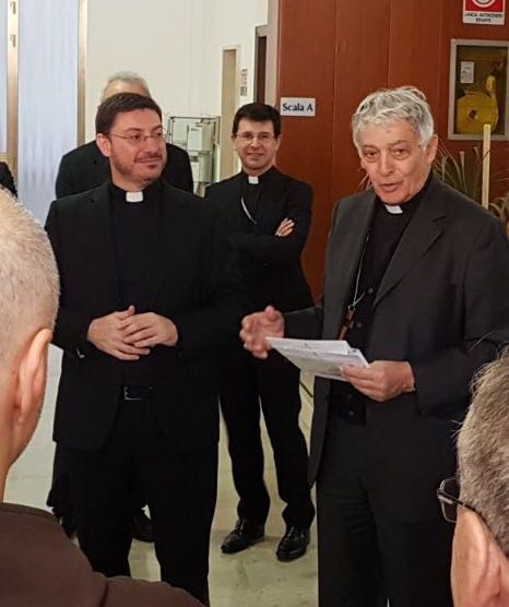Da sinistra Don Luciano Paolucci con il cardinale Menichelli, dietro il vescovo di Loreto Dal Cin, durante la comunicazione della nomina