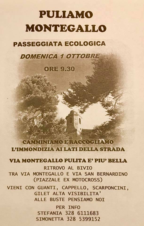 Partirà domani mattina, 1 ottobre, alle 9.30, all’incrocio tra via San Bernardino, la passeggiata ecologica su via Montegallo intitolata ‘Puliamo Montegallo’. L’opera di pulizia dei volontari si articolerà, fino a verso l’ora di pranzo, su un percorso di qualche chilometro sulla strada che corre fino a verso l’ex pista di motocross e la frazione di San Biagio di Osimo. Le auto  dei prtecipanti potranno essere lasciate nello spiazzo adiacente all’incrocio tra le due strade, ai confini tra le due città. Le organizzatrici della manifestazione ambientalista, Simonetta Antonelli e Stefania Nasuti, ricordano a tutti i volontari (sperano numerosi) di calzare scarponcini comodi ed indossare guanti, un cappello e un gilet ad alta visibilità per la sicurezza. “Le buste dove raccogliere i rifiuti di plastica, vetro e alluminio le forniremo noi” spiega Simonetta Antonelli in un video postato sui social media. Tutti possono partecipare, senza limiti di età.