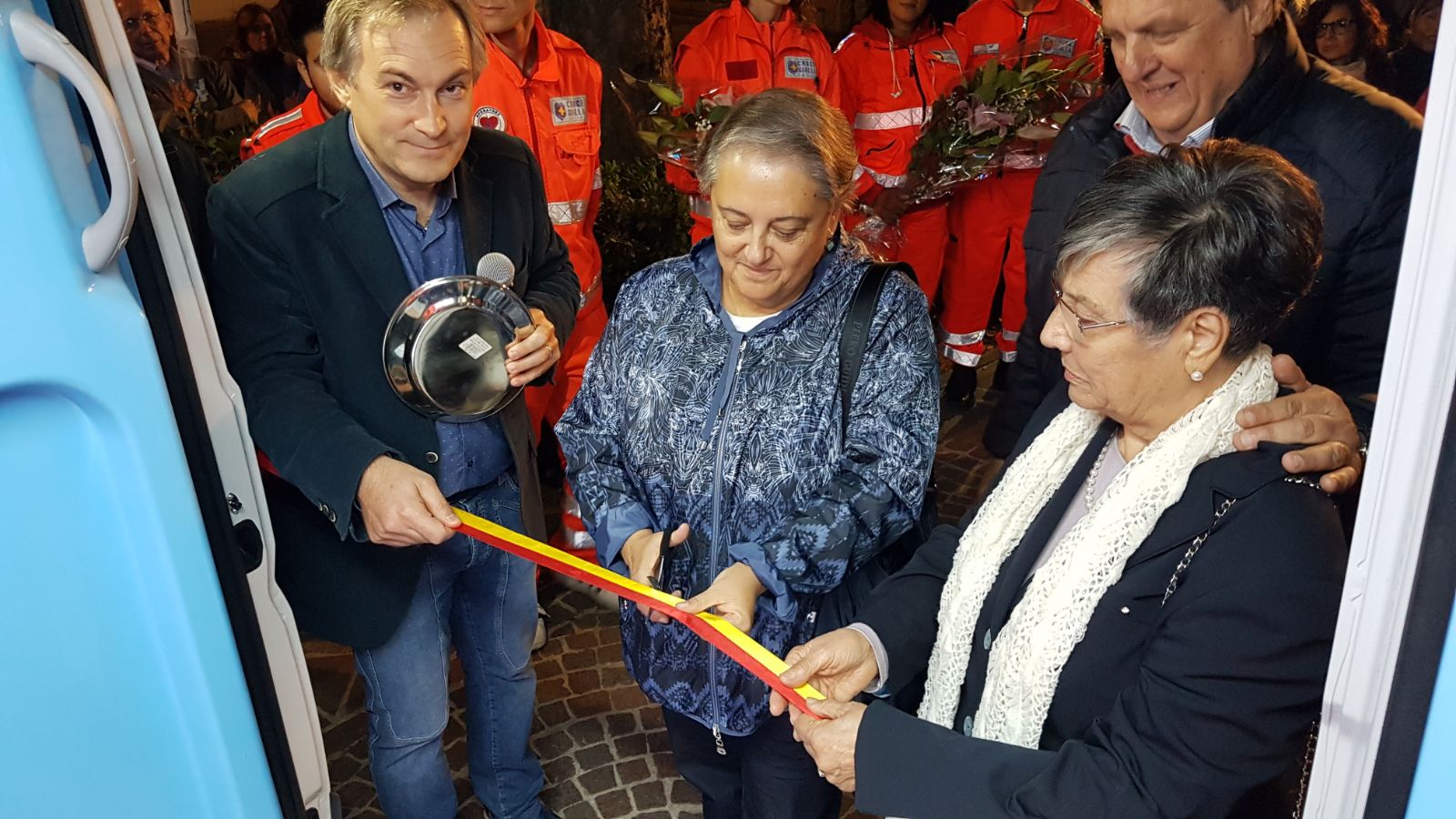 Il taglio del nastro, a sinistra il presidente della Croce Gialla Alberto Caporalini, il sindaco Mancinelli e Loretta Francella