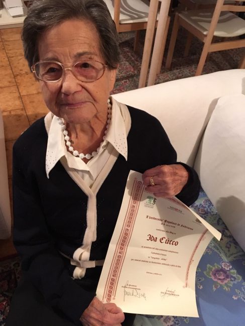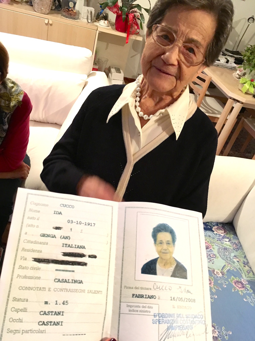 Cento anni fa, il 3 ottobre del 1917, nell’anno della rivoluzione d’Ottobre, nasceva la signora Ida. Che da oggi è diventata famosa. Ci accoglie in casa la figlia, Loretta Bartocci che ci racconta di come hanno organizzato questo compleanno speciale. Tanta gente oggi pomeriggio a festeggiare la centenaria Ida Cucco, nel complesso del San Benedetto di Fabriano: ospite d’onore il giornalista Paolo Notari della “Vita in diretta” di Rai 1 e le sue telecamere. A cento anni tondi tondi ha anche deciso di tornare a studiare, con l’iscrizione ai corsi dell’Università popolare di Fabriano. Signora quante cose avrà vissuto in 100 anni… Se ne ricorda una davvero speciale?