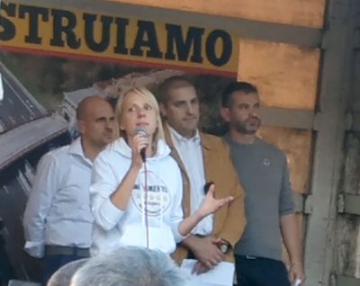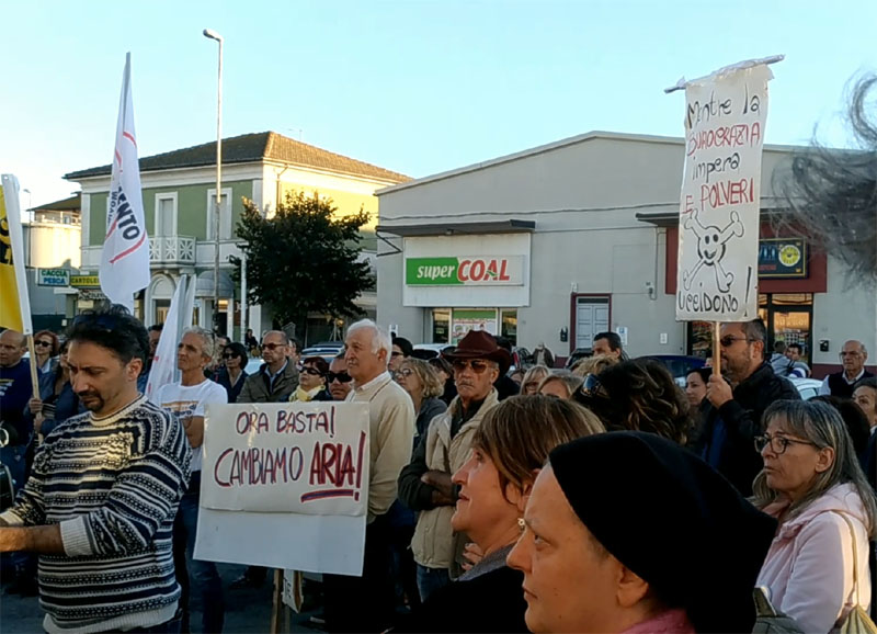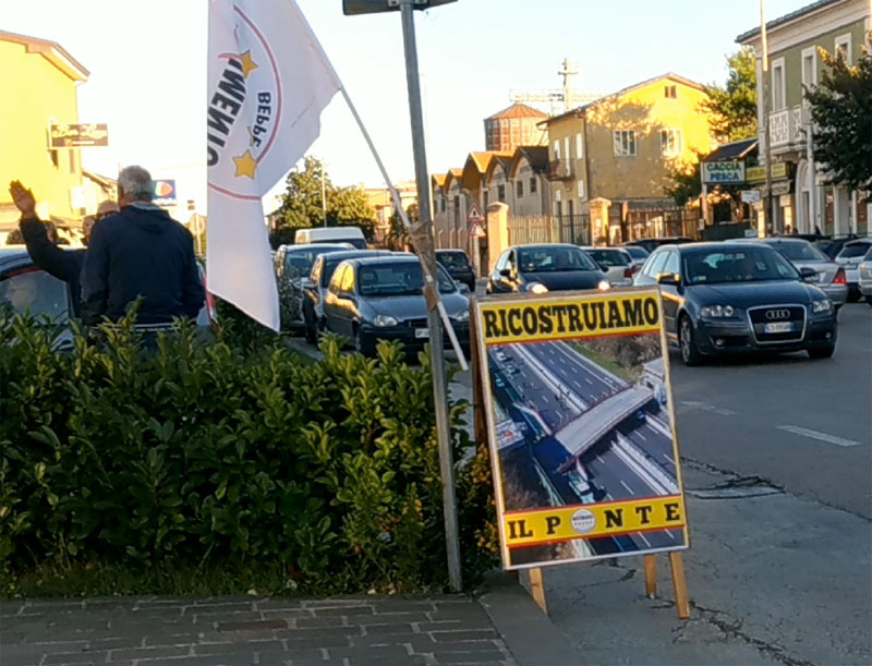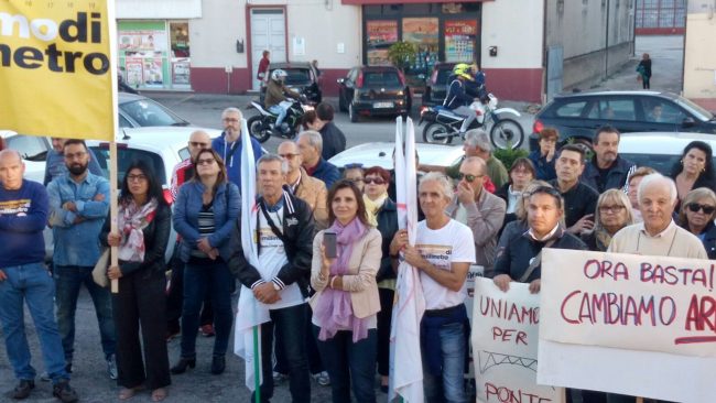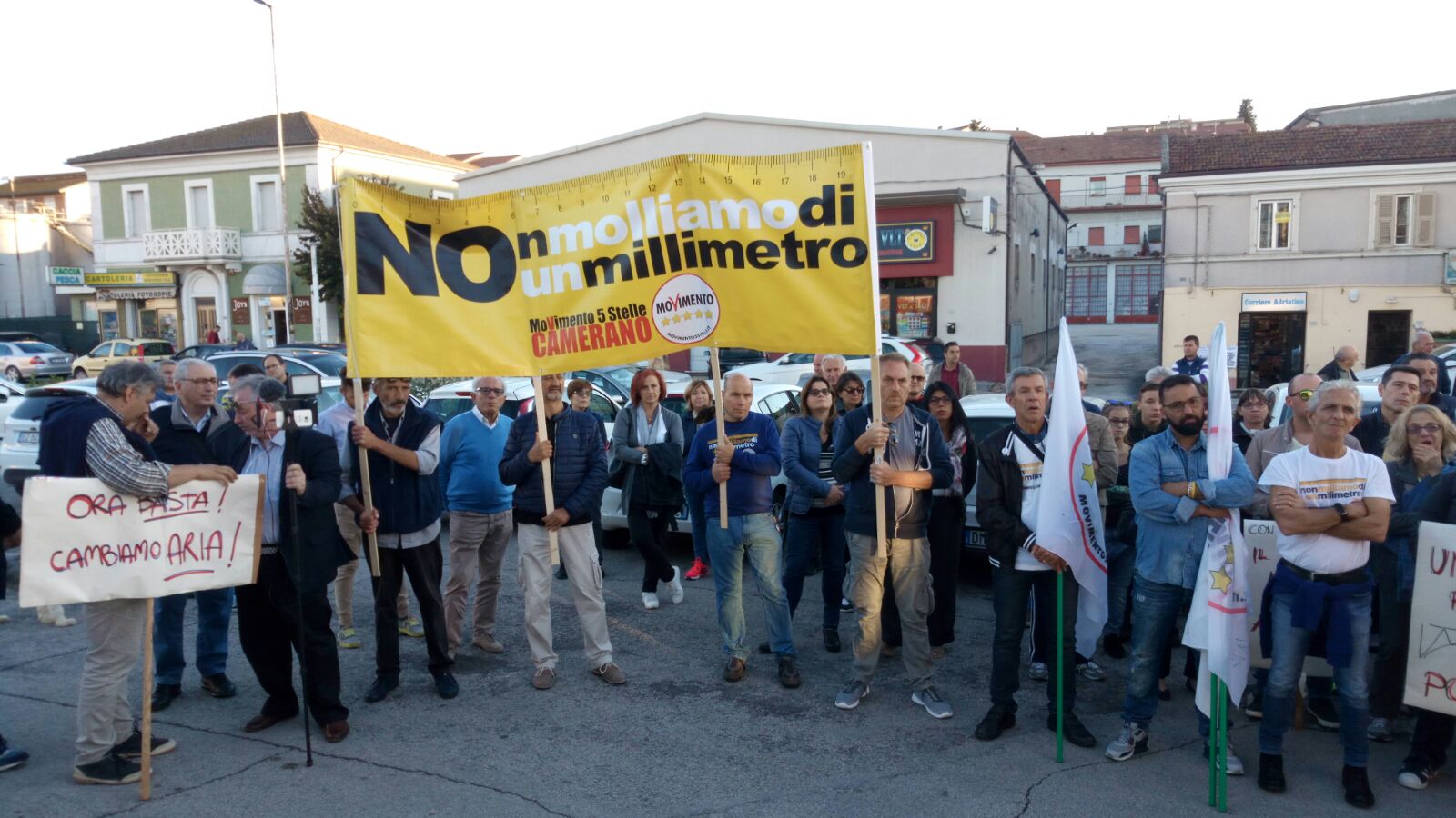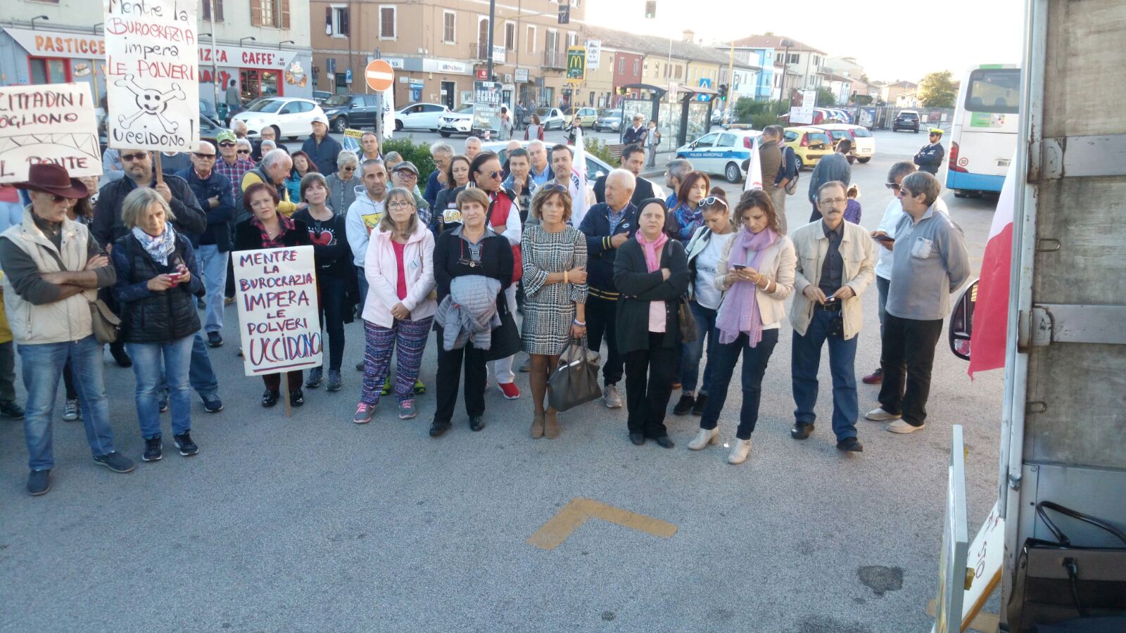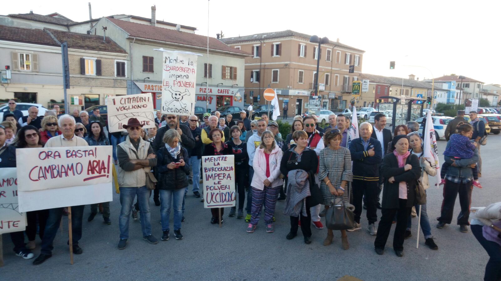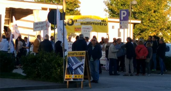 Sarà discussa martedì prossimo in consiglio regionale la mozione sul ponte crollato in A14 presentata dai coniglieri del M5S, ma della questione si occuperanno presto, in Commissione trasporti a Montecitorio, anche i parlamentari del movimento politico di Beppe Grillo. E’ la novità emersa nel corso della manifestazione di protesta che oggi pomeriggio ha visto schierati sulla piazzetta della stazione ferroviaria di Osimo Stazione, circa 200 attivisti (secondo dati degli organizzatori) di Osimo, Castelfidardo e Camerano. Un sit-in per sensibilizzare le istituzione al tema dell’inquinamento che sta soffocando la frazione osimana per l’aumento dei volumi di traffico convogliati sulla Statale 16. Oltre ai tre consigliere regionali grillini Gianni Maggi, Peppe Giorgini e Romina Pergolesi, hanno preso parte all’evento, tra gli altri, anche il sindaco di Castelfidardo, Roberto Ascani con le assessore Romina Calvani e Ilenia Pelati, i consiglieri comunali osimani David Monticelli, Sara Andreoli, Stefano Defendi di Camerano. Nell’impossbilità di raggiugere Osimo si è collegato telefonicamente da Roma con i manifestanti anche il deputato Andrea Cecconi che ha garantito il sostegno dei parlamentari del M5s per la risoluzione della vicenda in commissione Trasporti, attraverso la parlamentare Mirella Liutti in coordinamento con la Pergolesi.