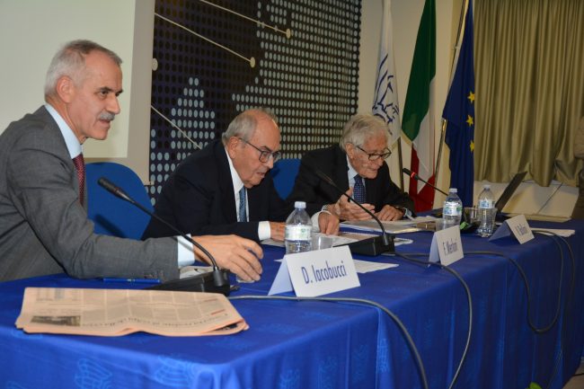 La presentazione della classifica delle imprese marchigiane da sx Iacobucci, docente Univpm, Francesco Merloni, presidente della Fondazione, Valeriano Balloni ideatore della classifica