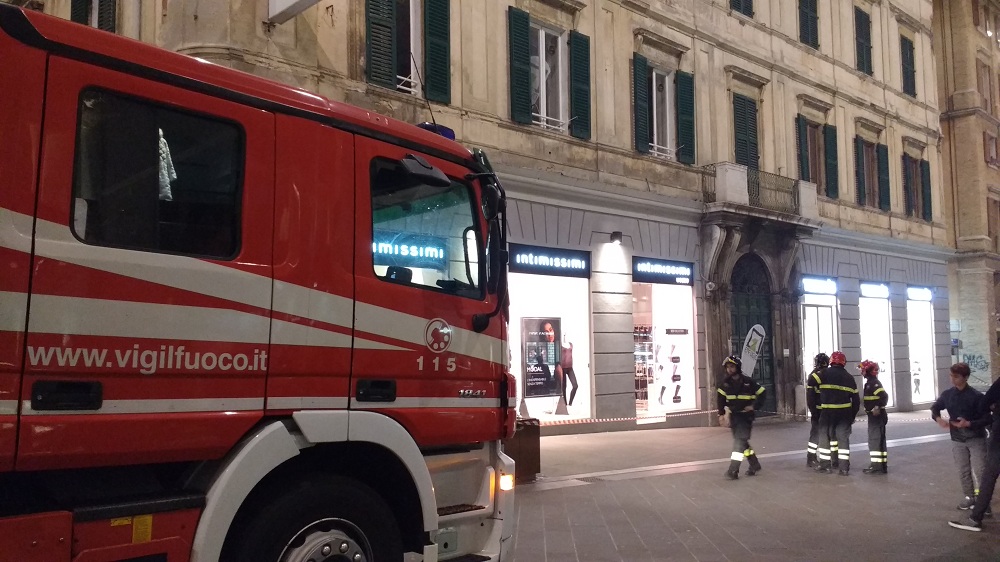 ANCONA – Sono dovuti intervenire i vigili del fuoco per mettere in sicurezza il palazzo dopo il distacco di un grosso calcinaccio, a pochi passi dai tavolini del Bar Torino