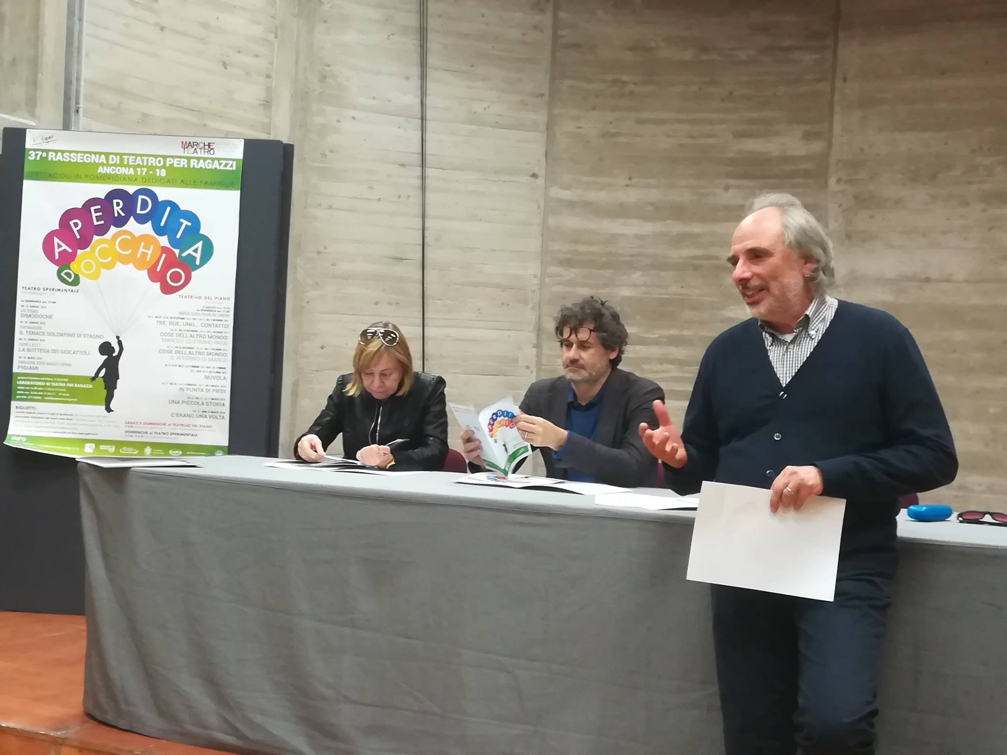 Teatro per ragazzi, riparte da sabato 21 ottobre la rassegna Aperditad’occhio 2017/2018 curata da Marche Teatro e Teatro del Canguro. Due i palcoscenici, lo Sperimentale di via Redipuglia e per il terzo anno sarà utilizzato il teatrino del Piano in via Maggini all’ex Crass, 16 i titoli per un totale di 70 recite rivolti ad un pubblico già a partire dai tre anni, tra compagnie ospiti da tutta Italia e le produzioni del Canguro e di Marche Teatro, oltre ai laboratori e alle attività nelle scuole. Numeri importanti per questa rassegna che è diventata una tradizione e un vanto, arrivata alla 37esima edizione. La chiave resta il mix di gioco, divertimento, insegnamento e partecipazione di bambini e ragazzi negli spettacoli. “Il teatro del Canguro è amato in città, è una scuola di comunità che fa un lavoro di semina sulle nuove generazioni” ha commentato l’assessore alla Cultura Paolo Marasca. “I contenuti possono essere semplici, ma sono vivi, a differenza dello schermo freddo di una tv. Così hanno più tempo per sedimentarsi e essere compresi” ha aggiunto il direttore artistico del Teatro del Canguro Lino Terra. “Abbiamo riscontrato un notevole bisogno di insegnare ai bambini il rispetto e lo stare insieme” ha spiegato Terra. Sabato alle 18 aprirà la rassegna allo teatrino del Piano la nuova produzione “Tre, due, uno… contatto”. Lo spettacolo anticipa tutta l’attività che proseguirà fino a marzo.
