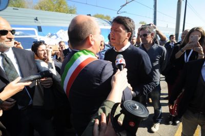 Matteo Renzi nello scalo di Osimo Stazione, appena sceso dal Frecciabianca con la carovana di ‘Destinazione Italia’