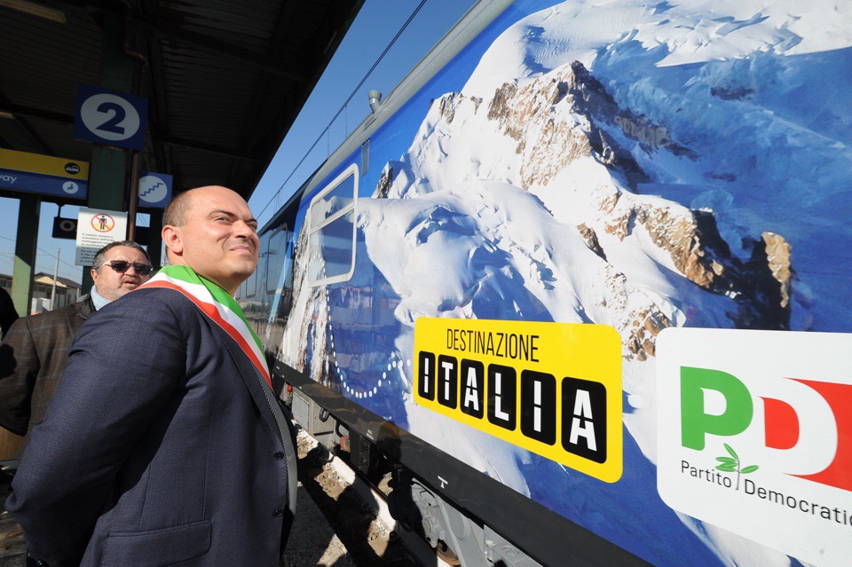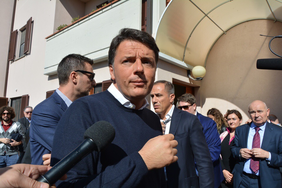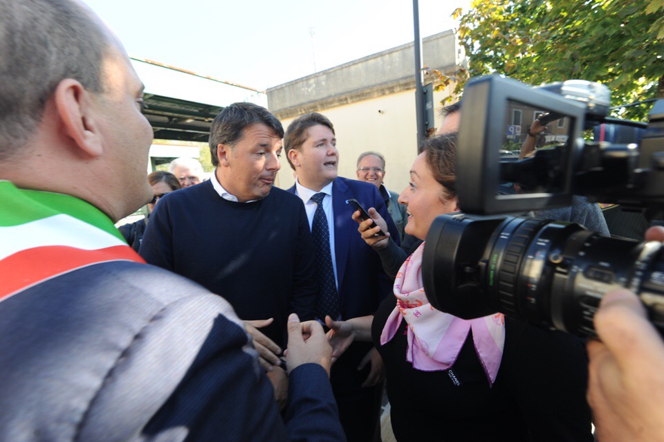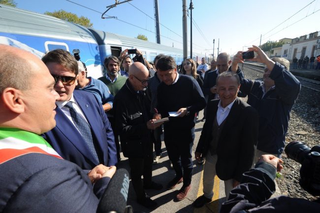 Matteo Renzi nello scalo di Osimo Stazione, appena sceso dal Frecciabianca con la carovana di ‘Destinazione Italia’