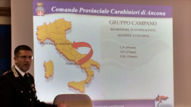 Il comandante del nucleo operativo dei carabinieri della compagnia di Ancona Americo Di Pirro illustra i risultati dell’operazione antidroga