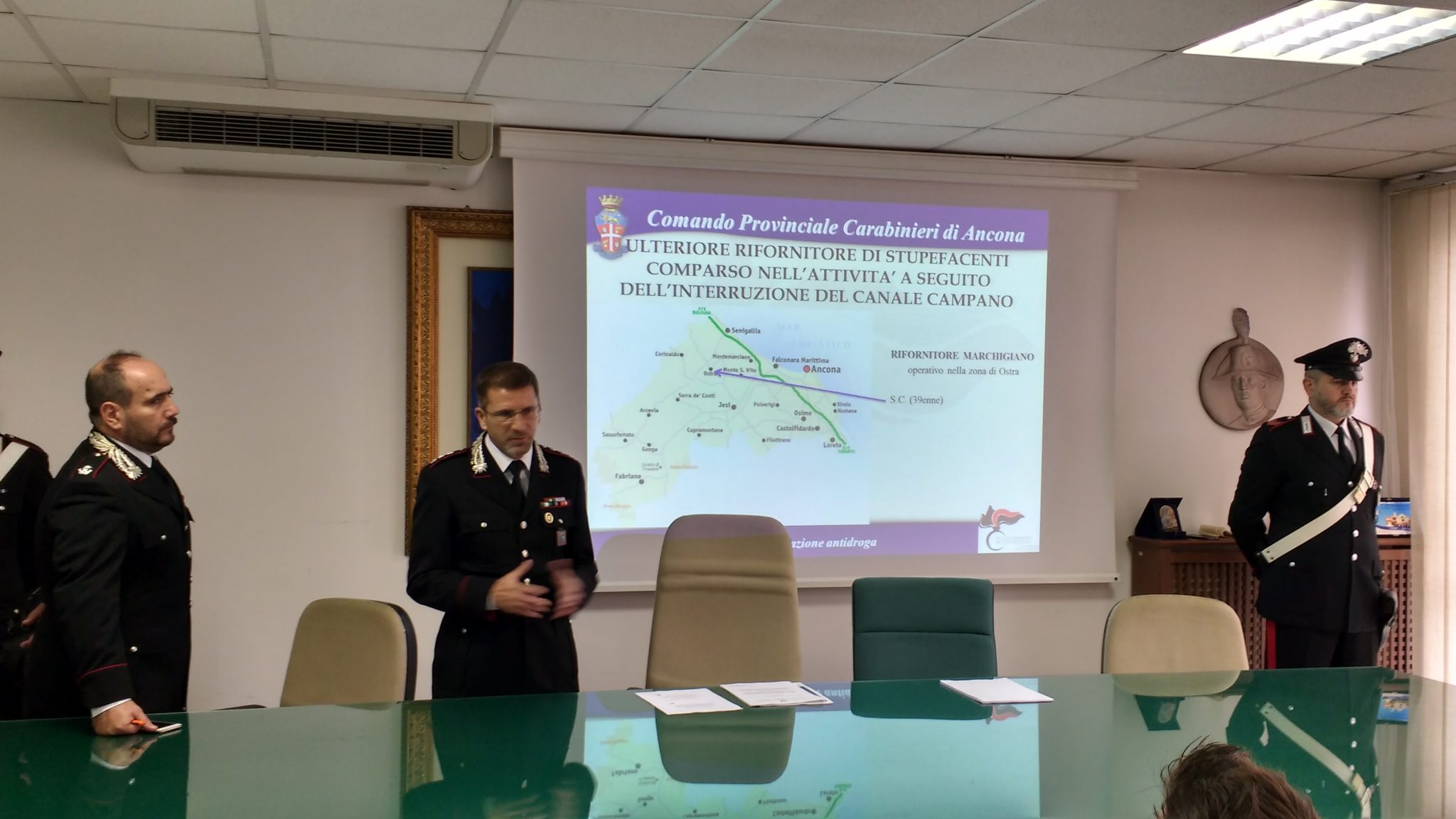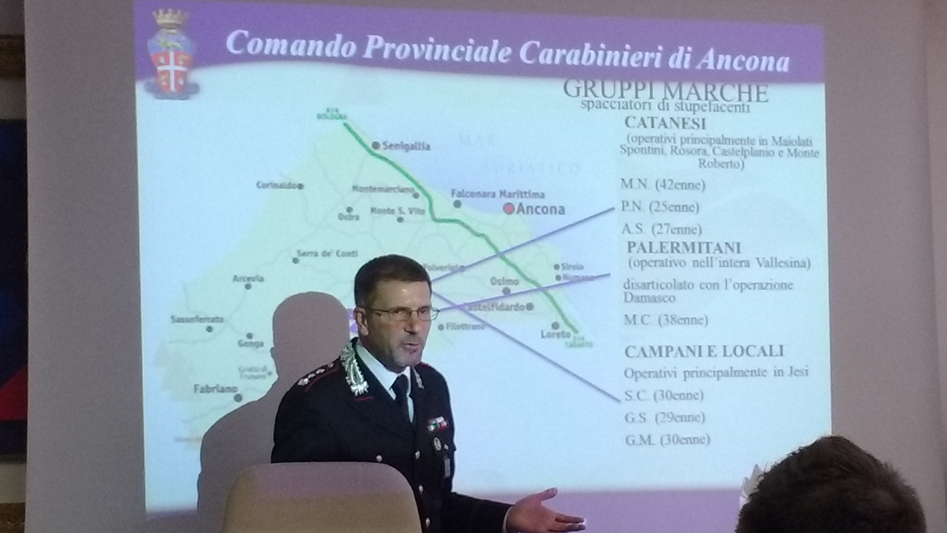 Il comandante del nucleo operativo dei carabinieri della compagnia di Ancona Americo Di Pirro illustra i risultati dell’operazione antidroga
