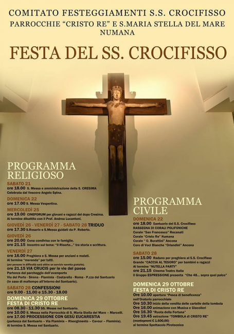 Numana festeggia da molti anni, sempre nell’ultima domenica di ottobre, la Sacra Immagine del Crocifisso, il Cristo Re, che è possibile adorare presso la Chiesa di Piazza del Santuario. Questa festa, molto sentita dalla cittadinanza, ha un significato particolare che risale ai secoli passati quando, al termine della buona stagione, i fedeli ringraziavano il Signore per la pesca favorevole, che al tempo rappresentava l’unico sostentamento familiare, e pregavano la Sacra Immagine affinchè le intemperie invernali permettessero loro di continuare le attività marinaresche. “In tutti questi anni – si legge in una nota stampa del Comune di Numana- si è sempre ripetuta la festa in Suo onore, durante la quale il corpo di Gesù viene ricoperto da una veste rossa, che rimanda al ricordo di quella tirata a sorte dai soldati romani che lo crocifissero: in passato veniva posta sul corpo dei malati e degli anziani Numanesi per pregare il Signore affinchè arrivasse la pronta guarigione. E’ da sottolineare che il 23 luglio di quest’anno, dopo accurati restauri compiuti grazie al contributo di sponsor locali, il Ss. Crocifisso è tornato nella Sua Numana risplendente nella sua bellezza”.