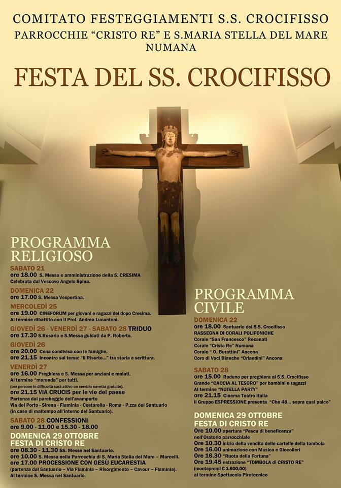 Anche quest’anno quindi, grazie all’organizzazione a cura della Pro Loco Humana Picena, oltre ad un nutrito programma religioso ce ne sarà uno civile altrettanto ricco. Si inizia sabato 28 Ottobre alle 15 con la tradizionale grande caccia al tesoro per ragazzi, con al termine Nutella Party; alle ore 18.30 presentazione del libro “Passione e morte di Gesù Cristo nella tradizione popolare marchigiana” presso la Biblioteca comunale di Numana. “Durante l’evento si ripercorreranno i momenti salienti della passione e morte di Gesù – ricorda la nota del Comune- attraverso la suggestiva interpretazione teatrale di testi dialettali, passi e poesie della letteratura tradizionale marchigiana; il libro, a cura di Manlio Baleani, è pubblicato nella collana dei Quaderni del Consiglio regionale ed è stato presentato all’ultimo Salone Internazionale del Libro di Torino”. Alle 21.15 presso il Cinema Italia, il Gruppo Teatrale “Espressione” presenta lo spettacolo “Che 48…sopra quel palco!” Domenica 29 ottobre, dalle 10 sarà aperta la pesca di beneficenza con la vendita cartelle della tradizionale “Tombola di Cristo Re” (montepremi di 1.600 euro, estrazione al termine della serata). Si proseguirà dalle 16 in Piazza del Santuario animazione con musica e giocoleria, con, al termine della serata, il consueto spettacolo pirotecnico.