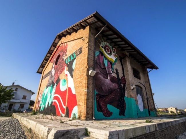 “Si parte di buonora: appuntamento alle ore 9 presso la stazione Ferroviaria di Montecarotto-Castelbellino, dove si trova la prima opera d’arte en plein air realizzata da Gio Pistone e Nicola Alessandrini, un murales a quattro mani intitolato “Aia”, con un grande gallo e figure antropomorfe che campeggiano sul deposito del magazzino merci. Da questa esplosione di colore si percorre la ferrovia fino ad arrivare a Castelplanio, dove si può ammirare l’opera “Chateau Plain”, un intreccio di forme, colori e figure sottili del collettivo di artisti Turbosafary. La terza tappa del tour è a Serra San Quirico dove i due grandi interpreti italiani 2501 e Basik hanno realizzato l’opera “Alfa e Omega”, ridisegnando la facciata del fabbricato viaggiatori con una texture di elementi astratti dalle linee sinuose, in cui si stagliano delle grandi mani nere. Il tour si conclude con la possibilità di pranzare al sacco e visitare la suggestiva Abbazia di Sant’Elena del XI secolo”.