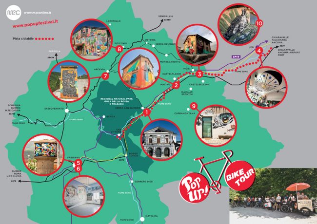 -ore 9.00 – registrazione partecipanti e partenza per il Pop Up! Bike Tour in Vallesina; una pedalata tra arte e natura, lungo la pista ciclabile (Genga – Falconara) che costeggia la ferrovia, con visita guidata alle opere di 2501, Basik, Nicola Alessandrini, Gio Pistone, Turbosafary, realizzate nelle Stazioni di Montecarotto-Castelbellino, Castelplanio, Serra San Quirico.
