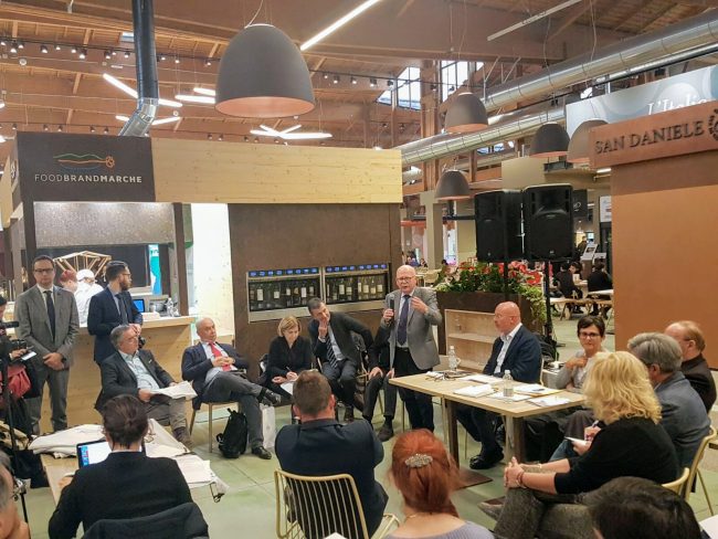 Il direttore dell’associazione Alberto Mazzoni all’apertura dello stand di Food Brand Marche a Bologna