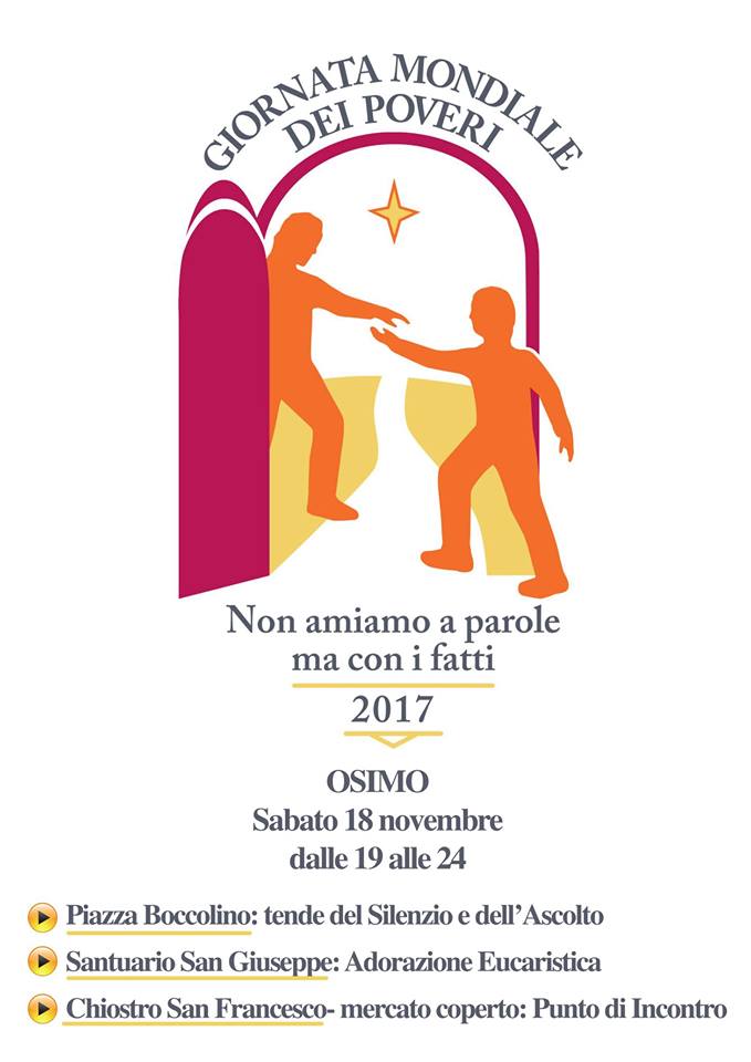 “La Chiesa di Ancona-Osimo e la Caritas Diocesana hanno risposto all’appello del Papa per creare momenti di sensibilizzazione, di incontro e di preghiera. – fa sapere una nota stampa della Caritas di Ancona-Osimo, diretta da Carlo Pesco – Ieri sera ad Ancona si è svolta una veglia di preghiera, riflessione e cammino guidata dall’arcivescovo della Diocesi Ancona-Osimo alla quale hanno partecipato sacerdoti, diaconi, volontari dell’Associazione Ss. Annunziata ed altri gruppi convinti che condividere con i poveri ci permette di comprendere il Vangelo nella sua verità più profonda. Sabato 18 ad Osimo in Piazza Boccolino, a partire dalle ore 18, verranno allestite due tende, una del Silenzio per creare uno spazio dove ciascuno potrà, a partire dalle parole del Messaggio, riflettere sulla propria condizione di povertà e su quella che vede attorno a lui, ed una dell’Ascolto perché è attraverso di esso che compiamo il nostro più importante gesto di carità. Nella Basilica di San Giuseppe da Copertino è previsto inoltre uno spazio di preghiera e nel Chiostro un punto di incontro e la proiezione di un filmato. ‘…Benedette le mani che si aprono ad accogliere i poveri e soccorrerli: sono mani che portano speranza…’ ”.