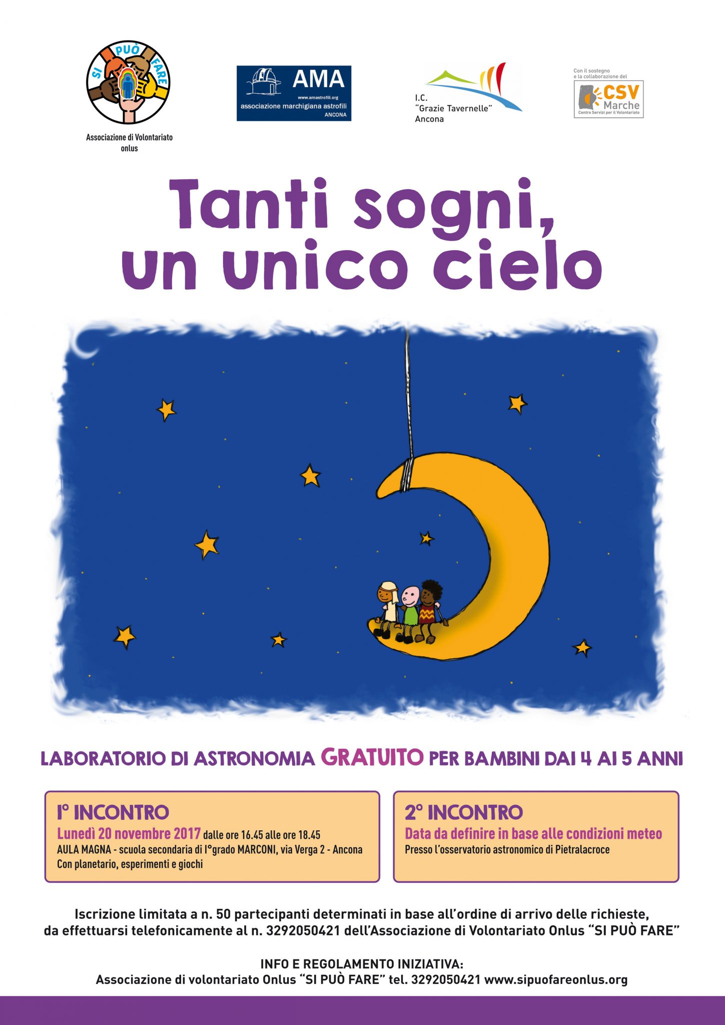 Valorizzare la capacità di sognare dei bambini e di sentirsi uniti sotto lo stesso cielo… un cielo tutto da scoprire con occhi di meraviglia. Si chiama “Tanti sogni, un unico cielo” ed è un’iniziativa promossa dalla onlus Si può fare in collaborazione con l’Ama (Associazione marchigiana astrofili), l’Istituto comprensivo “Grazie Tavernelle” e il Csv Marche -Centro servizi per il volontariato). Si tratta di tre laboratori gratuiti di astronomia per bambini di diverse fasce d’età, che comprendono un primo incontro in aula, con planetario, esperimenti e giochi per introdurre alla visione delle stelle, e poi un’uscita all’osservatorio astronomico di Pietralacroce per l’osservazione di luna e stelle.