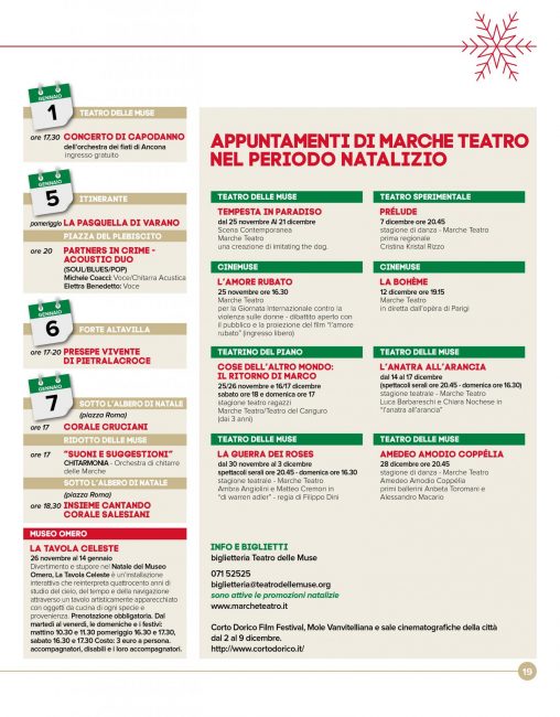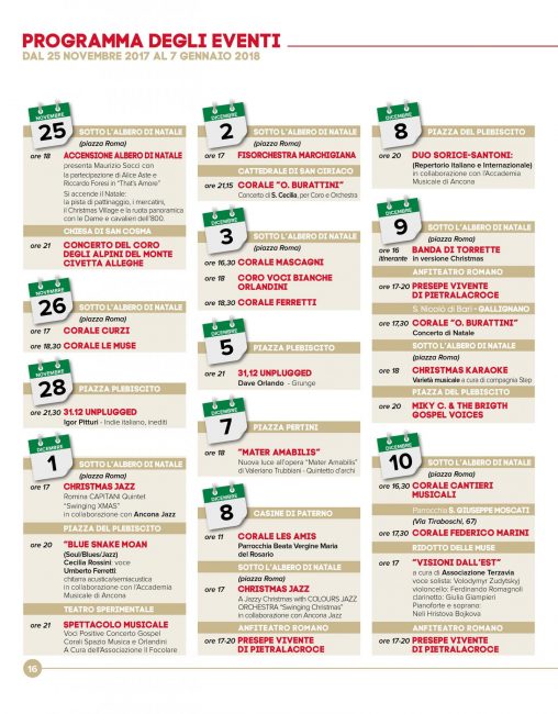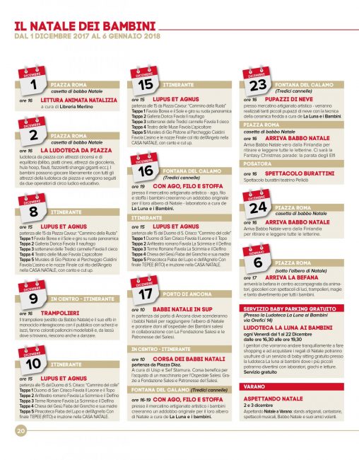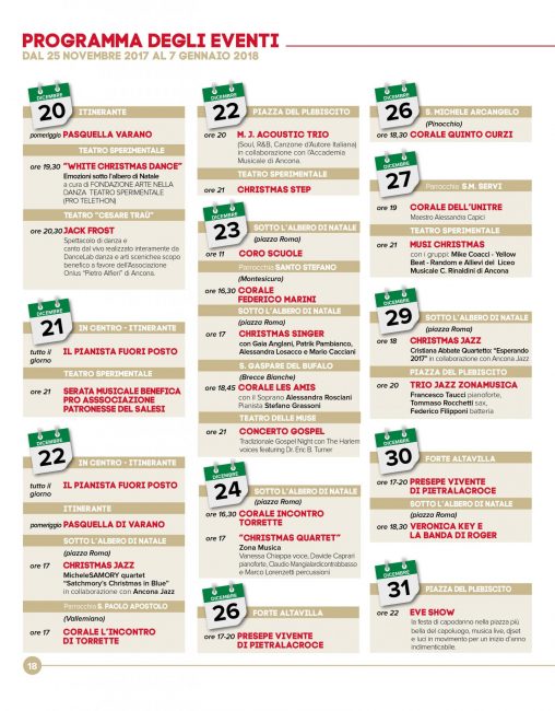 La giostra e tutte le luminarie saranno accese il 25 novembre alle 18 durante l’evento inaugurale dei festeggiamenti che si terrà in piazza Roma, ai piedi del monumentale albero di Natale proveniente da Alleghe. Sul palco si alterneranno le voci di Alice Aste, la giovane anconetana approdata alle prefinali di Sanremo Giovani, il concerto di Riccardo Foresi con la sua That’s Amore Orchestra, la corale di Alleghe e altri talenti come Patrick Pambianco. Accanto all’albero, la pista di pattinaggio sul ghiaccio professionale curata dal main sponsor Prometeo Estra, dove si potranno prendere lezioni dai maestri e dove le scuole potranno tenere le loro lezioni di educazione fisica. A partire da dicembre, gli elfi saranno in piazza Roma per incontrare tutti i bambini e ricevere le loro letterine, in attesa dell’arrivo di Babbo Natale, il giorno della vigilia. Per tutto il mese letture di racconti natalizi e fiabe, laboratori artigianali, esibizioni di artisti circensi e ludoteca in piazza. Piazza Cavour ospiterà le casette di legno per il mercatino di Natale, che quest’anno durerà 44 giorni, fino al 7 gennaio. A Piazza Pertini tornerà ChocoMarche e arriverà il Natale di CampagnAmica, a cura di Coldiretti. Anche a Varano e alla fontana delle Tredici Cannelle si potranno acquistare prodotti artigianali unici per i regali.