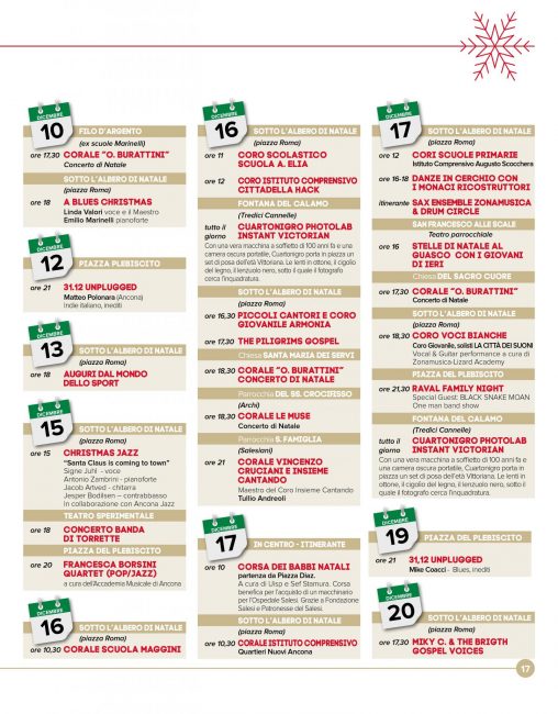 Dal 25 novembre al 7 gennaio sono previsti più di cinquanta appuntamenti musicali che avranno luogo non solo nelle vie del centro città, ma anche nelle principali chiese del capoluogo, in corso Amendola e al Piano San Lazzaro. Sotto l’albero di corso Garibaldi tutti i venerdì pomeriggio Christmas Jazz, con la collaborazione e l’ultra quarantennale esperienza di “Ancona Jazz”. In piazza del Plebiscito, invece, aperitivo sulle note di musica soul e pop italiana e straniera. E poi Linda Valori il 10 dicembre e l’immancabile Gospel Night al Teatro delle Muse dove si esibirà il The Harlem Voices feat. Dr. Eric B. Turner. Hanno suonato nei più prestigiosi gruppi gospel, soul e rock (Mariah Carey, Yolanda Adams, Fantasia, Shakira, Ronda Ross, U2, solo per citarne alcuni) e il Pastore e leader del gruppo, Eric B. Turner, ha cantato durante il ballo inaugurale della presidenza di Barack Obama nel 2009. Quest’anno il Natale entra in corsia con due concerti: il 17 dicembre all’Ospedale regionale di Torrette, e all’antivigilia di Natale all’Ospedale pediatrico Salesi.