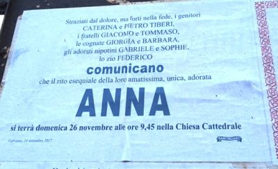 E’ rientrata in Italia la salma, per cui la famiglia ha scelto la cremazione, di Anna Tiberi, la giovane morta in Cina, secondo la polizia cinese, per colpa di un incidente lo scorso 4 novembre, una caduta dalla finestra dell’hotel dove soggiornava con due colleghe di lavoro a Ningguo. I manifesti funebri hanno riempito la città, ancora una volta, di un messaggio di dolore e ricordo della giovane ragazza. I genitori Caterina e Pietro Tiberi, i fratelli Giacomo e Tommaso, le cognate Giorgia e Barbara, gli adorati nipotini e lo zio Federico, daranno l’ultimo saluto alla loro adorata Anna domenica 26 novembre alle 9,45 nella Chiesa Cattedrale di San Venanzio.