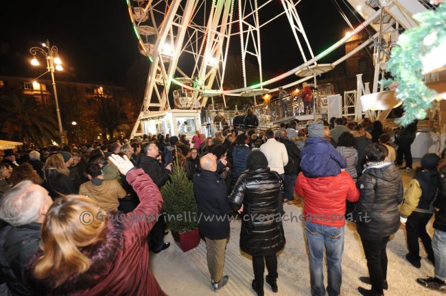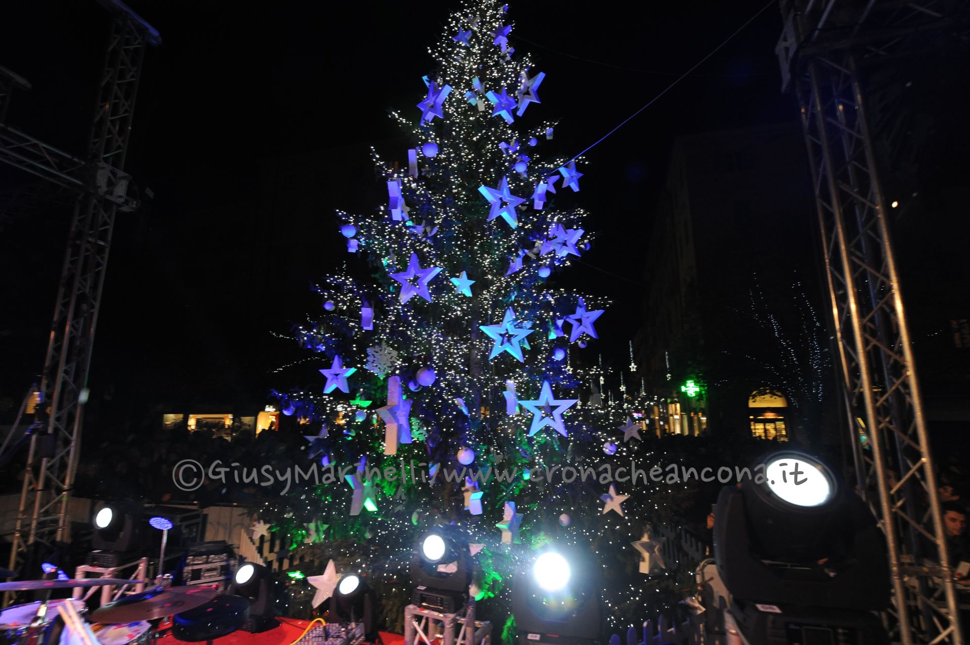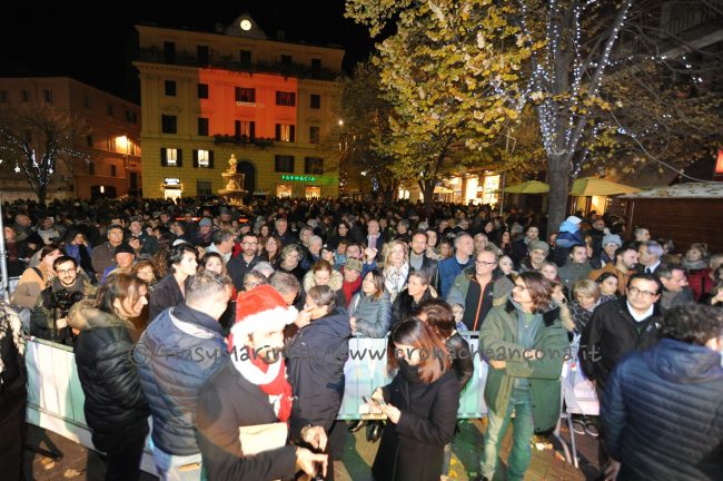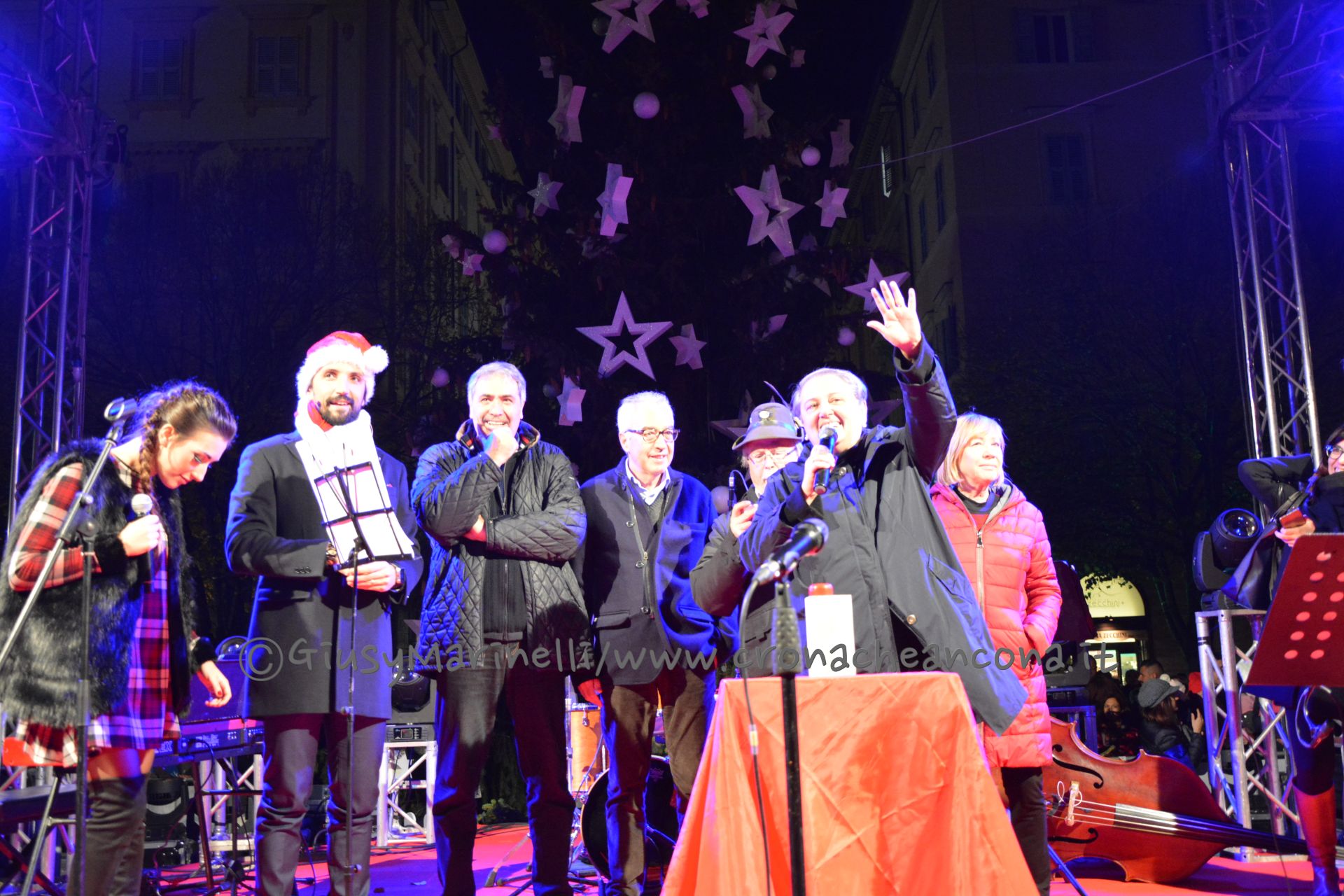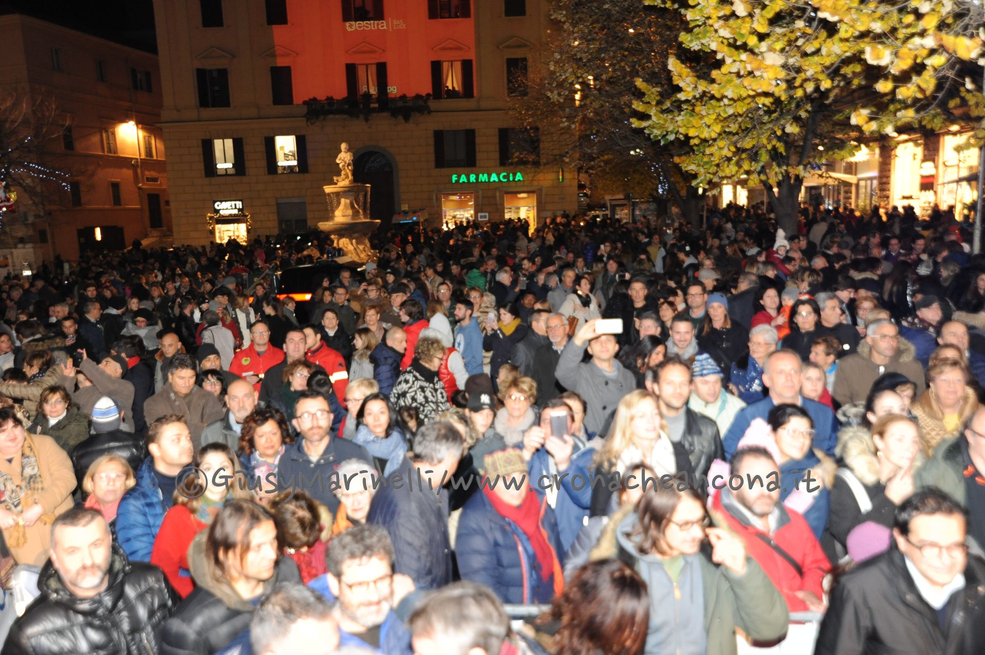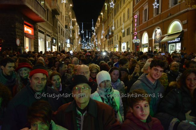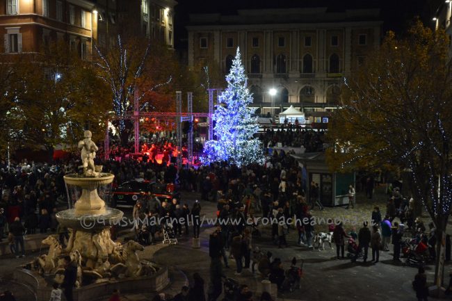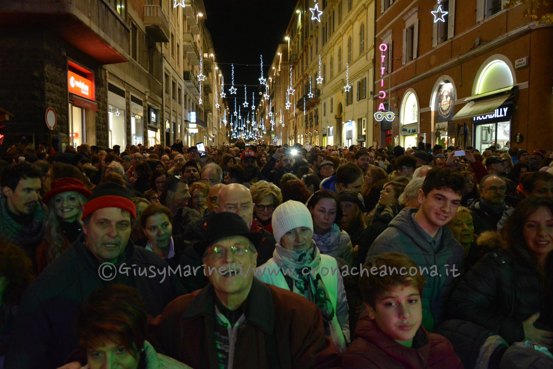 Il boato di stupore alla fine del conto alla rovescia si spande per tutta la piazza ed il corso che trabocca di gente. Il grande abete si accende ed illumina piazza Roma lasciata al buio per qualche minuto per creare l’atmosfera e far crescere l’attesa. Ed esplode la festa di questo Natale insieme. Quarantaquattro eventi che accompagneranno la città fino al prossimo 7 gennaio. «Per riscoprire il senso di essere una comunità ed il senso di appartenenza ad Ancona, che vogliamo sempre più bella», gli auguri del sindaco alle circa ventimila persone che hanno riempito le vie del centro per assistere allo spettacolo. Le luminarie sopra le teste accese all’unisono con l’albero alle 18 in punto. Le note di Oh Happy day nell’aria, cantate dalla voce di Alice Aste. E sembra davvero un giorno felice per molti.