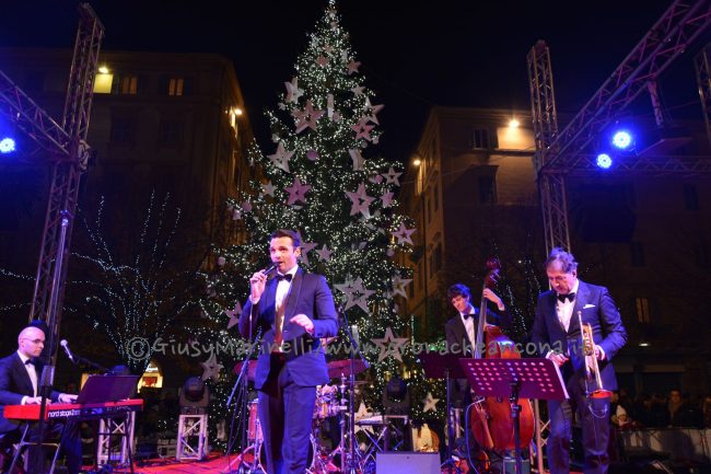Ancora immersi nel turbinio di luci e suoni, fa il suo ingresso in scena Riccardo Foresi e la sua That’s Amore Orchestra. Timbro e repertorio alla Bublè, divenuto negli anni, il cantante simbolo delle canzoni natalizie, Foresi ed i suoi musicisti sono la ciliegina sulla torta per entrare ormai appieno nell’atmosfera del Natale. Spiderman brando interpretato anch’esso da Bublè apre il concerto e cattura subito i più piccoli, ma ce n’è anche per i grandi con Nel blu dipinto di blu di Modugno e poi l’intramontabile Stand by me di B.B. King. Qualcuno scioglie le righe per continuare la passeggiata lungo le vie del corso, per fare i primi regali, approfittando ancora degli sconti del weekend del black friday.