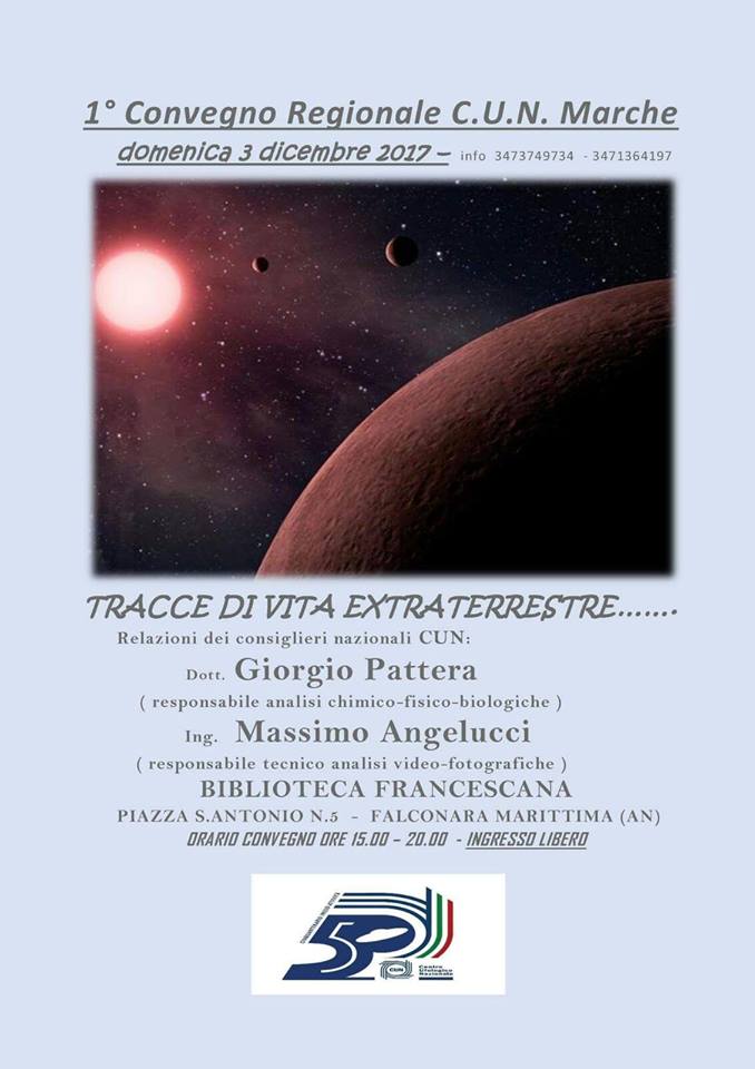 Due esponenti del consiglio del Centro ufologico nazionale, Giorgio Pattera (responsabile analisi chimico-fisiche-biologiche), Massimo Angelucci (responsabile tecnico analisi video-fotografiche), insieme all’ufologo chiaravallese Mirco Brunelli, saranno i protagonisti del primo convegno ufologico regionale organizzato a Falconara dal Cun Marche, organismo particolarmente attivo nella nostra regione (leggi l’articolo). L’appuntamento è per domenica 3 dicembre, dalle 15 alle 20, negli spazi della Biblioteca Francescana di Piazza Sant’Antonio 5. Si parlerà di ‘Tracce di vita extraterrestre’ con approfondimenti su un’area italiana, la Valmalenco di Sondrio, dove situazioni e avvistamenti anomali, vissuti non da singoli testimoni ma in certe circostanze da intere comitive, hanno dato vita a nuove tesi sul fenomeno Ufo. Molti sono stati infatti i casi di sfere luminose fotografate mentre volteggiavano a tutte le ore sul cielo della Valmalenco, l’angolo di Italia più studiato e analizzato dagli ufologici negli ultimi 6-7 anni. Tra questi, il caso di avvistamento di un oggetto non identificato a Chiesa in Valmalenco, nel 2013, è finito anche negli Xfiles dell’Aeronautica militare italiana. Si sarebbe trattato di ”una sfera o un disco del diametro di 8—10 metri” che emana ”luce arancione soffusa; direzione rettilinea ondeggiante; quota 500 metri circa”. Il convegno di Falconara è a ingresso gratuito (info ai seguenti recapiti telefonici: 347 3749734 oppure 347 1364197).