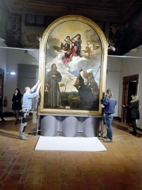 La maestosa Pala Gozzi, la “Sacra Conversazione” di Tiziano ha lasciato questa mattina la Pinacoteca civica di Ancona per il “regalo di Natale” ai milanesi: l’opera sarà al centro di un allestimento a Palazzo Marino, per la tradizionale mostra natalizia milanese. Un appuntamento culturale consolidato, frutta di una intesa tra i settori pubblico-privato particolarmente gradito dai cittadini e dai visitatori della città, che verrà presentato ufficialmente lunedì prossimo, 4 dicembre dai sindaci Giuseppe Sala e Valeria Mancinelli. L’operazione è per la giunta comunale una importante collaborazione tra le due città nel segno dell’arte e un riconoscimento verso la città di Ancona che – come sottolineano il sindaco e l’assessore alla Cultura del Comune di Milano – “sta svolgendo un ruolo particolarmente sensibile e attivo come centro di raccolta e protezione di numerose opere proveniente dai territorio del sisma”. L’esposizione dell’imponente capolavoro del pittore cinquecentesco sarà allestita dal 5 dicembre al 14 gennaio, con accesso gratuito. La Pala d’altare, opera giovanile di Tiziano, è stata nelle ultime settimane protagonista alla Pinacoteca Podesti della mostra “Tiziano & Tiziano, due capolavori a confronto” insieme a “La Crocefissione”, realizzata dal Maestro in età avanzata e collocata abitualmente nella chiesa di San Domenico.