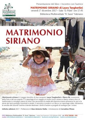 Matrimonio siriano è il viaggio benefico di due neosposi, Laura Tangherlini e Marco Rò, innamorati della Siria e del suo popolo. È il reportage di un viaggio ai confini turco-siriano e libano-siriano che si è trasformato in immagini piene di colori che raccontano la realtà del dramma siriano attraverso le voci e le storie dei tanti profughi incontrati e aiutati dai neosposi in due viaggi in Libano e Turchia. Il libro sarà presentato dall’autrice oggi, 1 dicembre alle 17.45, presso la Sala conferenze “D. Pilati” della Biblioteca Multimediale Fabriano “R. Sassi”.
