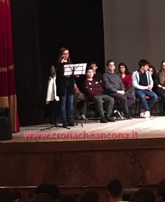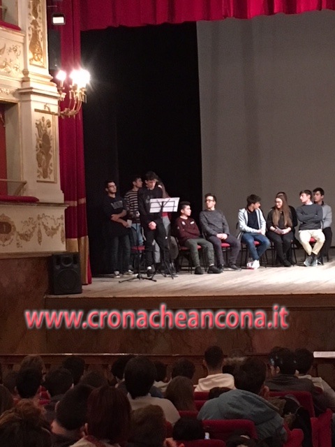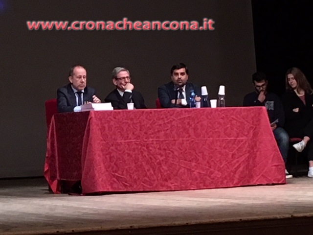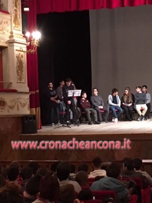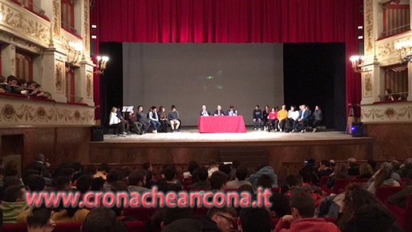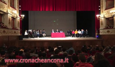 I relatori dell’incontro di oggi sul palco del teatro Gentile, con gli studenti delle Superiori di Fabriano
