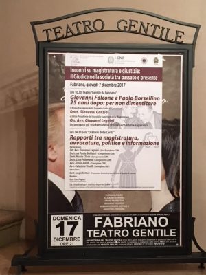 Falcone e Borsellino non sono morti invano, venticinque anni fa. Il loro è un esempio per tutti i magistrati. Si è tenuto oggi l’omaggio ai giudici siciliani vittime della mafia, in occasione del 25° anniversario delle stragi di Capaci e Via d’Amelio, nell’incontro su “Magistratura e Giustizia: il giudice nella società tra passato e presente”, organizzato dall’associazione Giuridica Fabrianese ‘Carlo Galli’, con il patrocinio del Consiglio Nazionale Forense, dell’Ordine degli Avvocati di Ancona e del Comune di Fabriano. Stamattina dalle ore 10.30 hanno dialogato con gli studenti delle scuole secondarie superiori di Fabriano, sul palco del Teatro Gentile, importanti esponenti della Magistratura: Nicola Clivio del Csm, il primo presidente della Suprema Corte di Cassazione, Giovanni Canzio, il vice presidente del Consiglio superiore della magistratura, Giovanni Legnini. I relatori hanno risposto alle domande degli studenti e commentato i testi Cose di Cosa Nostra di Marcelle Padovani e L’assedio di Giovanni Bianconi.