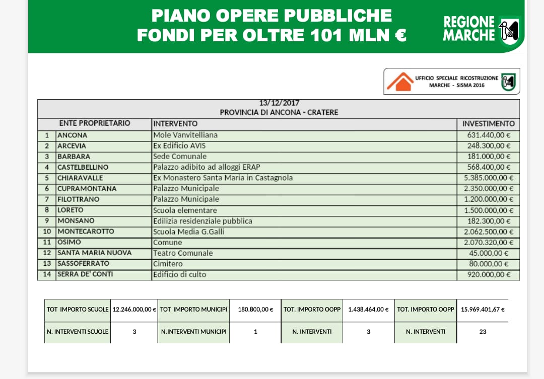 Per il lavori nella Scuola elementare della frazione di Marischio sono a disposizione 1.246.000 euro. Un ultimo beneficiario dei contributi per le opere pubbliche è l’AATO 2 (Consorzio di Autorità di Ambito Territoriale Ottimale – Marche Centro): i lavori al serbatoio pensile per un acquedotto a Fabriano, nella frazione di San Donato, valgono 155.400 euro. Interessante fuoriprogramma per Sassoferrato, comune della provincia di Ancona fuori cratere: arrivano i finanziamenti per il lavori di aggiustamento del cimitero, per 80mila euro, per Osimo altri 2,1 milioni di euro che permetteranno di sistemare la torre civica e palazzo comunale (leggi l’articolo). “Una bella sorpresa” ha commentato il sindaco Simone Pugnaloni. Soddisfatta anche Loreto. L’assessore regionale Moreno Pieroni ha annunciato che anche la città mariana, da lui guidata come sindaco per 10 anni, è assegnataria di un finanziamento che servirà per sistemare la Scuola Elementare Marconi. Il contributo ammonta a 1.500.000 euro quale Comune fuori cratere della Provincia di Ancona. “E’ con grande soddisfazione che comunico questa notizia – scrive l’assessore regionale – che andrà a beneficio di tutta la collettività di Loreto ed in particolar modo di tutti gli scolari, le famiglie e del corpo insegnante”. Notizie positive anche per Cerreto d’Esi, lo annuncia il vice sindaco e assessore ai lavori pubblici Giovanni Montanari. Nell’incontro di ieri pomeriggio a Macerata a cui hanno partecipato i sindaci dei comuni inclusi nel cratere del sisma di ottobre 2016 con i responsabili dell’Ufficio Speciale per la Ricostruzione (per le province di Macerata e Ancona), sono stati elencati i Comuni che riceveranno i fondi per l’edilizia pubblica e scolastica. “Buone notizie quindi per Cerreto d’Esi, siamo soddisfatti, pensavamo di non rientrarci”, fa sapere l’assessore. Per il comune dell’anconetano incluso nel cratere insieme a Fabriano, dopo il decreto legge 205/2016, saranno disponibili 6 milioni per il polo scolastico unificato e 383.064 euro per i lavori nella residenza protetta per anziani.