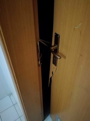 Gli evidenti segni di effrazione lasciati sulle porte dei vari uffici assegnati ai gruppi sportivi al PalaBadiali