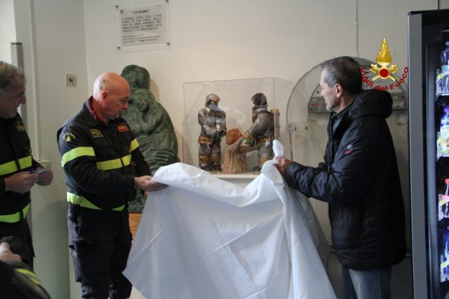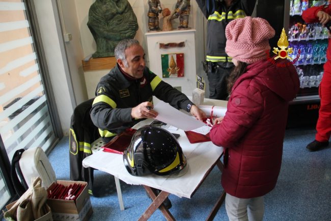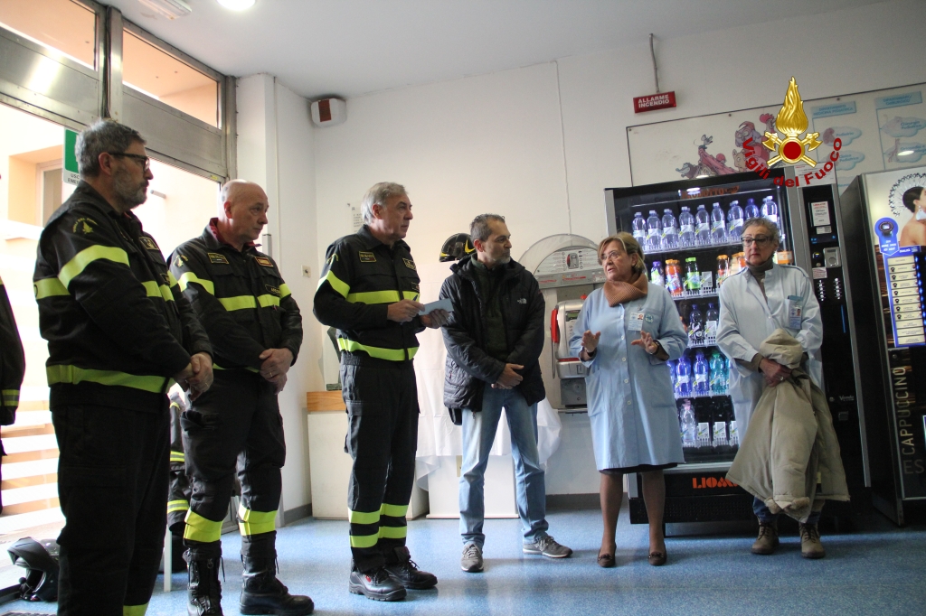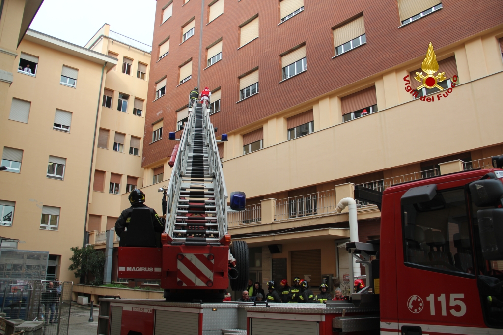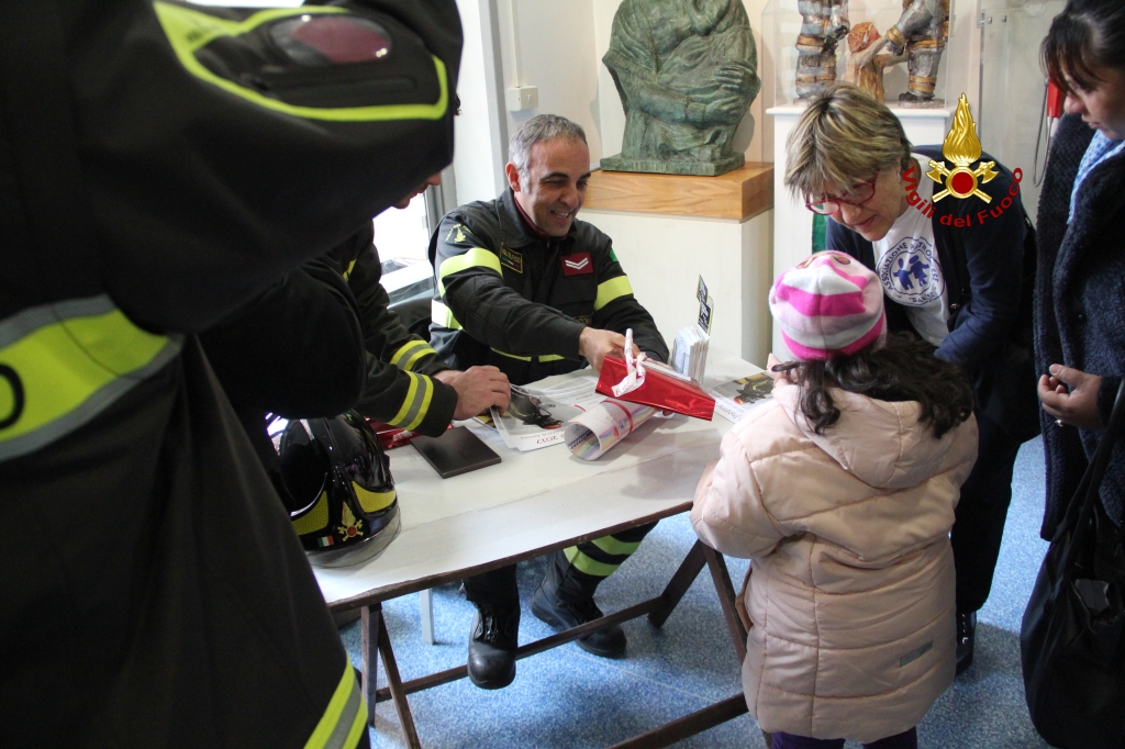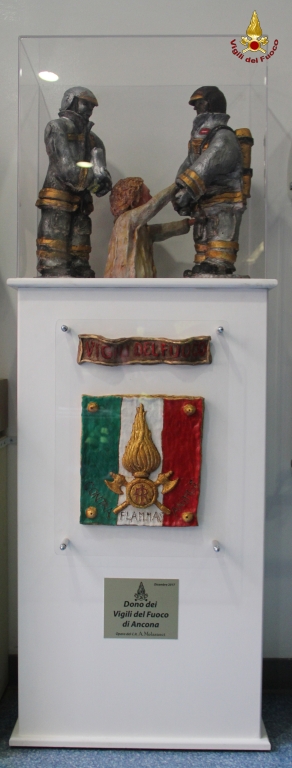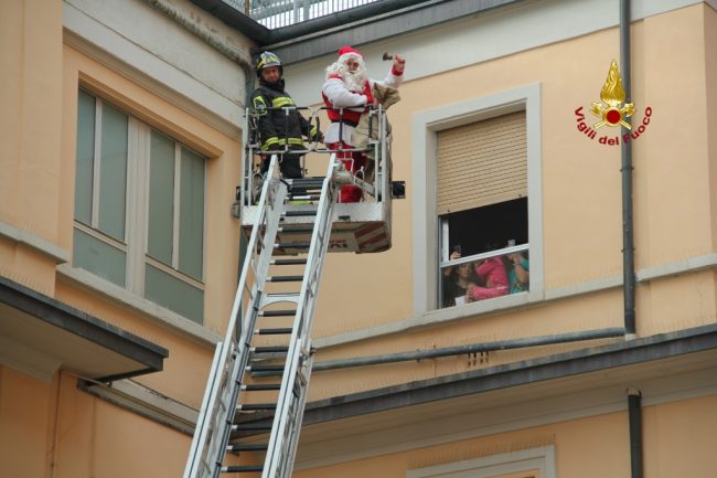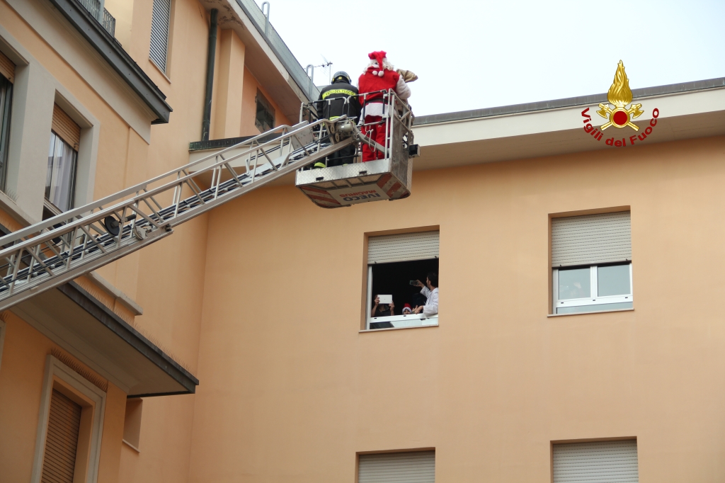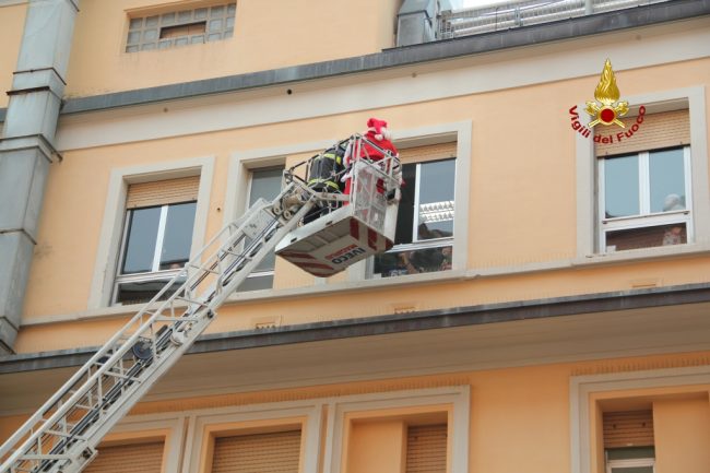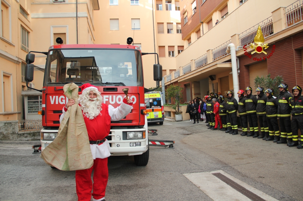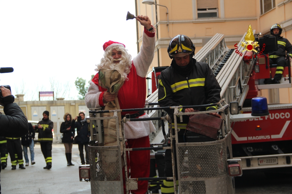 Babbo Natale arriva in autoscala per i piccoli degenti dell’ospedale pediatrico Salesi. Sorpresa stamattina dei vigili del fuoco, che hanno rinnovato anche quest’anno la loro iniziativa di solidarietà per i piccoli degenti del materno infantile. I Babbo Natale dei vigili del fuoco dorici, con in testa il comandante provinciale Michele Zappia, hanno visitato i bambini, tutti rimasti a bocca aperte nel vedere i mezzi e gli uomini del corpo in azione. Dalle 9.30 i Babbo Natale hanno incontrato i bambini nei diversi reparti dell’ospedale e consegnato il diploma di giovane pompiere, insieme ad un simpatico gadget frutto di una raccolta fondi tra tutti i vigili del fuoco della provincia di Ancona. All’ospedale è stata consegnata una statua in terracotta lucidata a cera intitolata “vi vogliamo bene” raffigurante due vigili del fuoco e un bambino realizzata da un artista d’eccezione, il capo reparto dei vigili del fuoco dorici Angelo Melaranci che nel tempo libero si diletta a realizzare queste opere.
