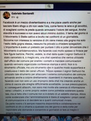 In Consiglio il sindaco Santarelli ha risposto confermando il proprio operato, motivandolo come già detto su Facebook, in via ufficiosa, con queste parole: “Troppo spesso il signor Gattucci ha utilizzato tale strumento (la chat ndr) per attaccare il sistema comunicativo del comune arrivando anche a colpire direttamente i dipendenti” con “attacchi mai rivolti alla carenza di informazione verso i cittadini”, criticando “il fatto che il Comune non si è dotato di un addetto stampa”. “L’amministrazione è libera di scegliersi i propri canali di comunicazione. Da parte nostra c’è sempre massima disponibilità – continua il Sindaco di Fabriano – per “consentire ai giornalisti di fare al meglio il proprio lavoro”.