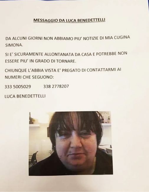 ore 10.42 – Simona è scomparsa, la famiglia chiede aiuto tramite i social network, sperando che qualcuno l’abbia vista. L’annuncio è stato lanciato dal cugino della donna di 43 anni residente a Castelfidardo, Luca Benedettelli, dichiarando che la cugina non è rincasata da un paio di giorni. I familiari temono che la donna non sia in grado di fare ritorno a casa e non riescono a mettersi in contatto con lei. Dalle prime risposte ricevute dai social network, la donna sarebbe stata avvistata giovedì mattina nella zona dell’ospedale pediatrico Salesi di Ancona e poi, ieri sera, alla stazione di Ancona dove è stata vista salire su un treno. Ai familiari, che da ore stanno tappezzando di volantini con la sua foto, diversi luoghi di aggregazione, sono arrivate segnalazione anche da Osimo ed altre città limitrofe a Castefidardo.