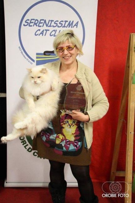 Horus Heka, campione del mondo 2016, in braccio alla proprietaria Loredana Baldinelli, Il gatto con il blasone dell’allevamento Horus di Castelfidardo è il campione WCF 2016