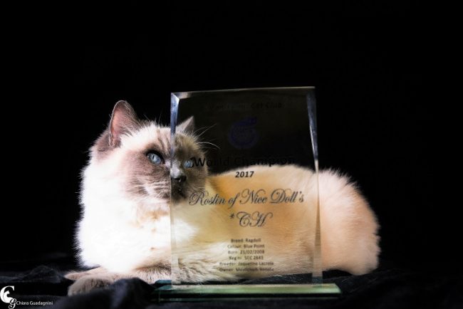 Occhi blu, pelo color bianco-cipria, passo felpato ed elegante. Lo scorso 2 dicembre all’Esposizione Internazionale Felina di Castelnuovo-Modena, Nicedolls*Roslin di Horus ha conquistato il titolo World Champions-‘Gatto più bello del mondo’ sfilando davanti ai giudici di ogni nazionalità del World Cats Federation (WCF). La super gattona di 9 anni che ha spopolato al concorso modenese battendo tutti i finalisti, ha così aggiunto una nuova medaglia nel palmares della Horus RagDoll di Castelfidardo. Negli ultimi anni questo allevamento di gatti di razza ragdoll si è quotato nei gotha delle gare internazionale ottenendo tre titoli mondiali: all’ultima vittoria si aggiungono quelle strappate del 2016 da due esemplari maschi: Horus Heka e due anni prima da Dollsndudes Amon Ra.
