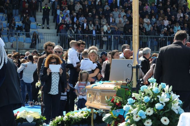 La moglie e i figli salutano Michele Scarponi durante il funerale partecipato da migliaia di persone