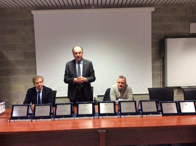 Il presidente del Coni Marche, Fabio Luna (in piedi), il vice presidente del Comitato regionale, Giovanni Torresi (a sx), Emiliano Guzzo, presidente Fit Marche (a dx)
