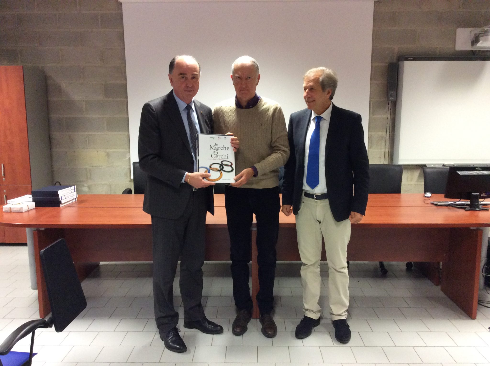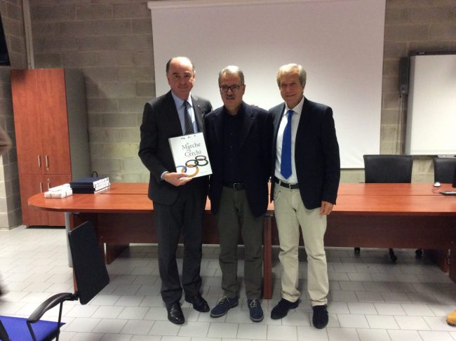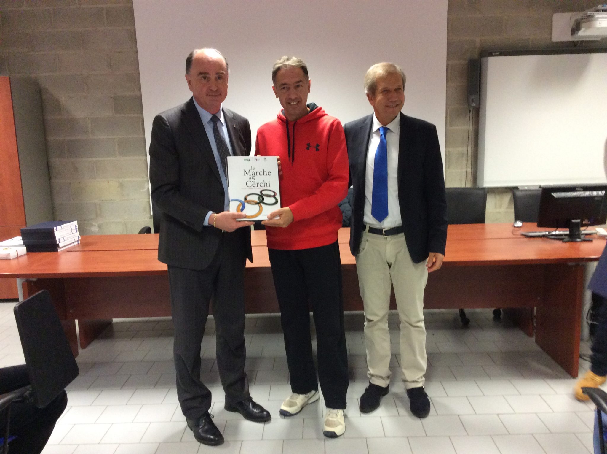 Il presidente del Coni Marche, Fabio Luna (in piedi), il vice presidente del Comitato regionale, Giovanni Torresi (a sx), Emiliano Guzzo, presidente Fit Marche (a dx)