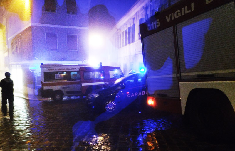 I soccorsi di 118, carabinieri e vigili del fuoco ieri sera in via Strigola, nel centro storico di Osimo