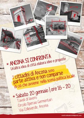 Un’altra idea di città, iniziativa nata per dare vita a una piattaforma politica e civica, si allarga e si organizza: sabato 20 gennaio dalle ore 16 alle 20 al Circolo Germontari di Ancona i cento promontori del progetto chiamano cittadini e cittadine a discutere i grandi temi del Comune e le modalità di partecipazione alla vita politica. L’esperienza politica comunale nata dal basso e impostata con metodi rigorosamente partecipativi si strutturerà per coinvolgere al massimo la cittadinanza, a partire dal nome della lista al candidato sindaco da presentare alle prossime elezioni comunali. Due i tavoli in cui si divideranno i partecipanti: programma elettorale e forme organizzative. Al termine del confronto l’assemblea discuterà in plenaria le proposte e adotterà le migliori. Continuano intanto a crescere le adesioni al progetto che raccoglie il favore di ampi settori della città: lavoratori, professionisti, studenti e pensionati.