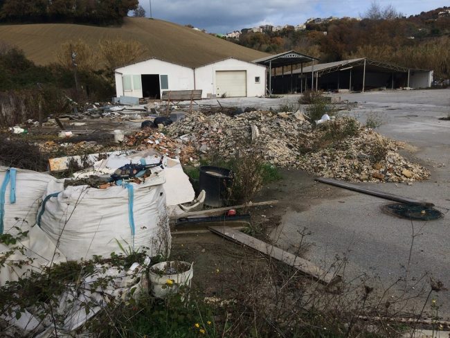 Un’area industriale ridotta a una sorta di terra di nessuno, nel verde delle valle del Miano, appena fuori dell’omonimo (Vallemiano) rione di Ancona, a pochi metri dall’inizio dell’area protetta del Parco del Conero. Una terra di nessuno, quella dove sorge l’ex stabilimento della srl Edilcost. Perché di fatto, come minimo da tre anni, abbandonata a se stessa, e facilmente accessibile. Trasformata, in pratica, in un’enorme discarica, in buona parte a cielo aperto. Dov’è difficile demarcare i confini tra i quintali e quintali di materiale di risulta e di servizio “figlio” dell’attività produttiva della società edile a responsabilità limitata – dichiarata fallita con sentenza del Tribunale di Ancona il 7 maggio 2015 – e l’altrettanto gigantesca quantità di ciò che, ugualmente classificabile come rifiuti, è stato depositato probabilmente e piratescamente un po’ a macchia di leopardo su una superficie complessiva di ben 3.800 metri quadri.