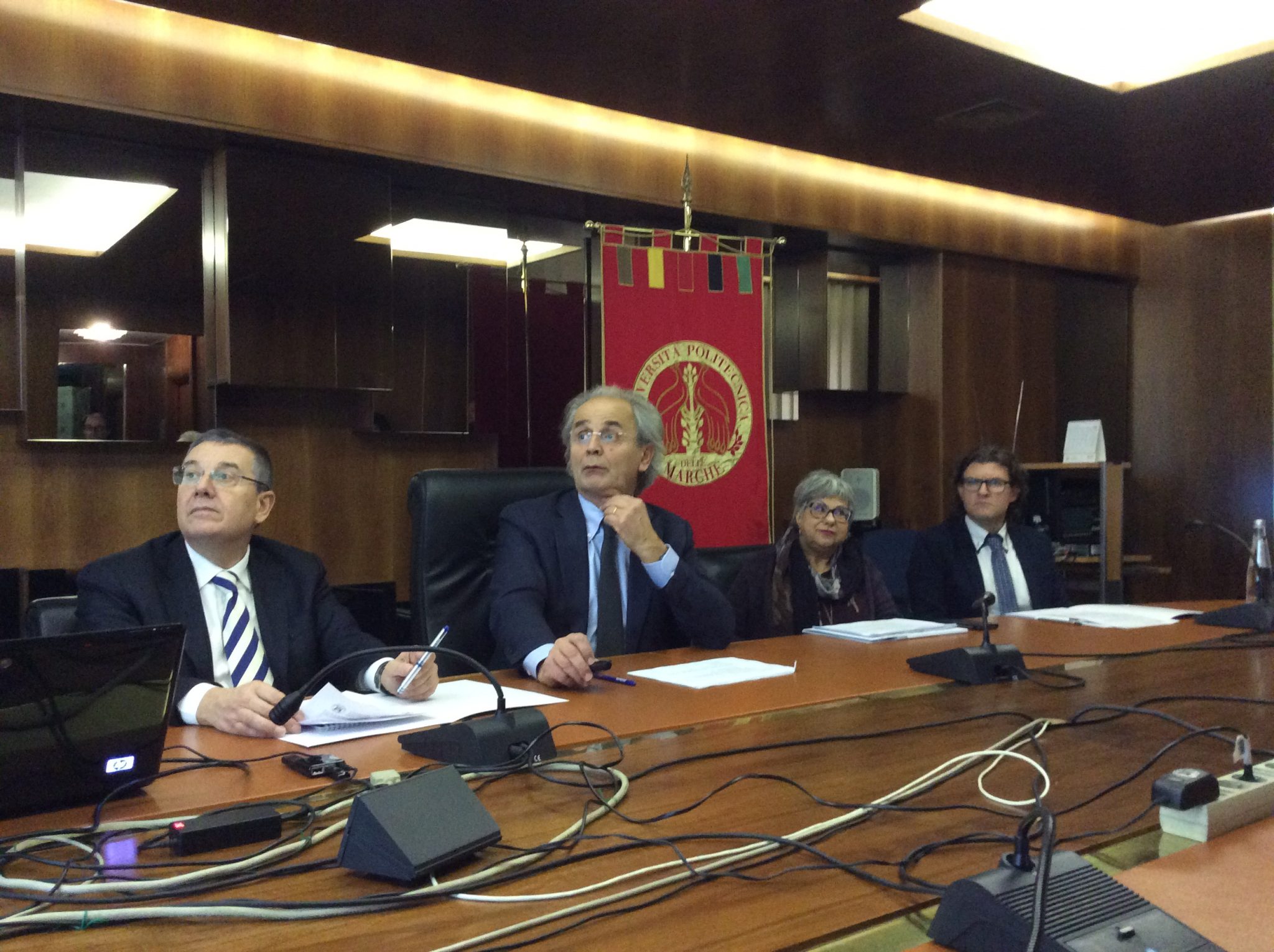 Da sinistra, il pro rettore, Gian Luca Gregori, il rettore della Politecnica, Sauro Longhi, la direttrice generale, Rosalba Valenti, il vice direttore, Alessandro Iacopini