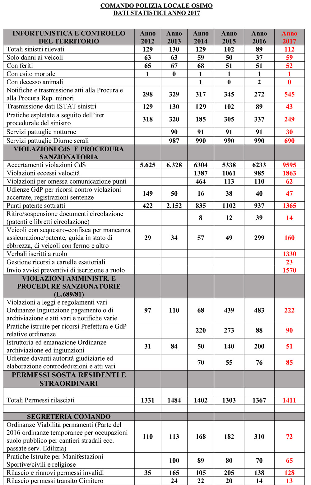 L’assessore alla Polizia locale, Federica Gatto, sottolinea che“la Polizia Municipale abbia svolto la propria attività conseguendo ottimi risultati nonostante la carenza di organico dovuta ai numerosi pensionamenti avvenuti nel 2017. A tal proposito, nel 2018 si procederà con l’implementazione di 3 nuove unità (leggi l’articolo). Come ribadito anche dalla responsabile del Commissariato di Pubblica Sicurezza di Osimo, il vice questore Mariella Pangrazi, nel suo saluto alla città nell’ultima seduta del Consiglio Comunale per l’imminente pensionamento (leggi l’articolo), i reati, in particolare per furti e rapine, sono in calo. Diminuisce, però, la percezione della sicurezza da parte dei cittadini”.