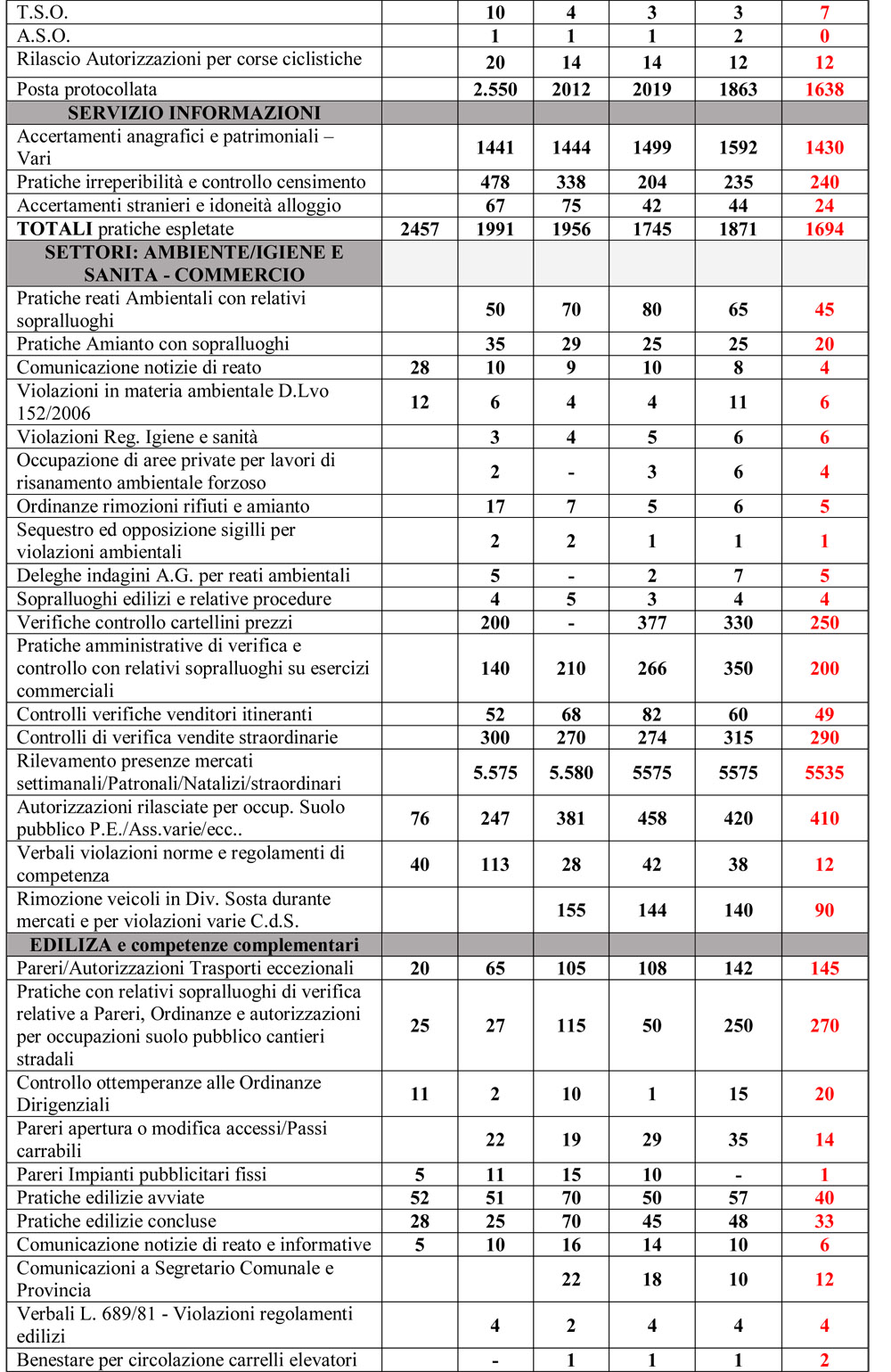 Il capitano Vescovo conferma che “il numero degli incidenti stradali rilevati e gestiti i quali, nonostante un calo dei servizi di pattuglia per diminuzione del personale, sono aumentati da 89 a 112, gli atti gestiti su richiesta o delega delle Procure che da 272 sono passati a 545, il numero delle sanzioni gestite che è aumentato di oltre un terzo, e così via dicendo. Infine una nota particolare per affermare la professionalità e la dedizione al lavoro dei componenti il Corpo di Polizia Locale va evidenziata con il conferimento degli encomi che L’Amministrazione comunale ha voluto rilasciare ad alcuni nostri operatori durante la manifestazione di consegna delle Civiche Benemerenze”. Nell’esprimere il proprio ringraziamento, anche l’assessore Gatto, come il sindaco Simone Pugnaloni, ricorda i 5 operatori della Pm di Osimo insigniti dell’encomio per azioni e condotte meritevoli in tema di sicurezza urbana. I premiati sono i marescialli maggiori Paolo Barbini e Adriano Bartomioli, gli agenti Barbara Ferraioli, Giorgio Mengoni e Nicola Ricci (leggi l’articolo).