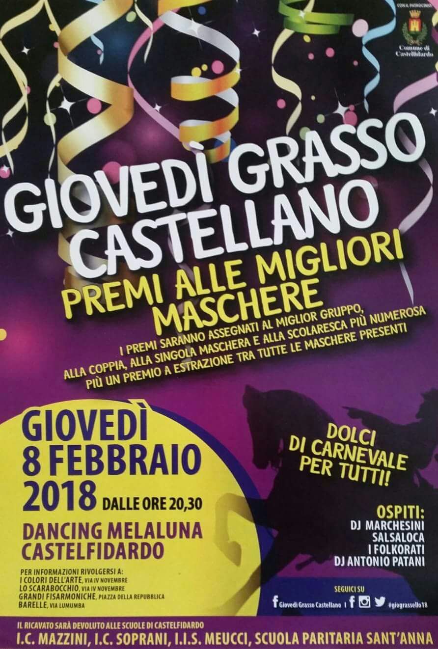 Giovedí 8 febbraio, dalle 20.30 al Melaluna Center Dance, andrà in scena il ‘Giovedì grasso castellano’. E’ la terza edizione della festa con maschere e coriandoli che nei precedenti appuntamenti ha riscosso un notevole consenso di pubblico. “Quest’anno – fanno sapere gli organizzatori – i premi sono davvero molti e accontenteranno tutti con grande divertimento. Saranno premiati i migliori gruppi e, tra le novitá, anche per la scolaresca mascherata più numerosa. Musica, premi alle migliori maschere singole, di coppia e in gruppo, dolci di carnevale per tutti e una finalità solidale devolvendo il ricavato agli istituti scolastici di Castelfidardo: I.C. Soprani, I.C. Mazzini, IIS Meucci, Istituto Sant`Anna. Comitato Giograssello Castellano”. La serata sarà animata dai Dj Pierfrancesco Marchesini & Antonio Patani che si alternarneranno in consolle, i Salsa Loca guideranno le danze e i Folkorati improvviseranno stornelli.