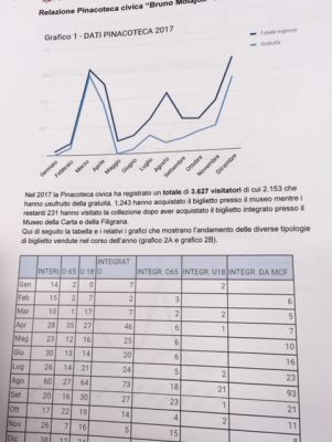 Sono stati 23.538 i biglietti emessi dal Museo della Carta e della Filigrana nel 2017, contro i 39.263 del 2016. Il 2018 è già inziato bene per il Museo della Carta e della Filigrana, poiché sono già 7.150 le prenotazione delle scuole. Sebbene sia solo una previsione ottimistica, segna già più del doppio del dato delle visite scolastiche dell’anno precedente: erano 3.151, un numero che fotografa il crollo nelle scelte delle gite scolastiche a seguito del terremoto di agosto e ottobre 2016. Nel 2016 il Museo aveva avuto ben 14.960 visite da parte degli studenti, segno che la funzione educativa e specifica di questo plesso è indubbiamente conosciuta e riconosciutoa dal sistema scolastico. Nel 2017 sono stati 3.627 i visitatori della Pinacoteca Bruno Molajoli  in aumento rispetto al 2015 e al 2016 rispetto a cui cui le visite sono più che raddoppiate. «I picchi del 2017 si sono avuti nei mesi di febbraio, agosto e dicembre, e questo la dice lunga anche sulle attività organizzate durante le Feste natalizie», analizza il Sindaco. O comunque, segnala che Fabriano è stata allettante soprattutto nei periodi canonici delle vacanze, e la Pinacoteca resta un “grande classico”. La Pinacoteca da fine 2017 è anche sede di un laboratorio domenicale per bambini dai 4 agli 11 anni, curato da ArcheoMega e Art Comes To Town, in cui hanno già partecipato un centinaio di piccoli. «A prezzi assolutamente popolari – dice Venanzoni – poiché i genitori che hanno tanti bimbi devono pagare solo un ingresso, il biglietto è di 3 euro, gratuito per i genitori e per i bimbi al di sotto di 6 anni, e l’offertà è molto educativa, curata dall’impresa che ha già la gestione della Pinacoteca e da un’associazione che ha come scopo principale la didattica dell’arte».