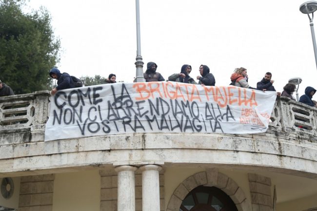 Lo striscione appeso dai primi manifestanti arrivati ai giardini Diaz in tarda mattinata